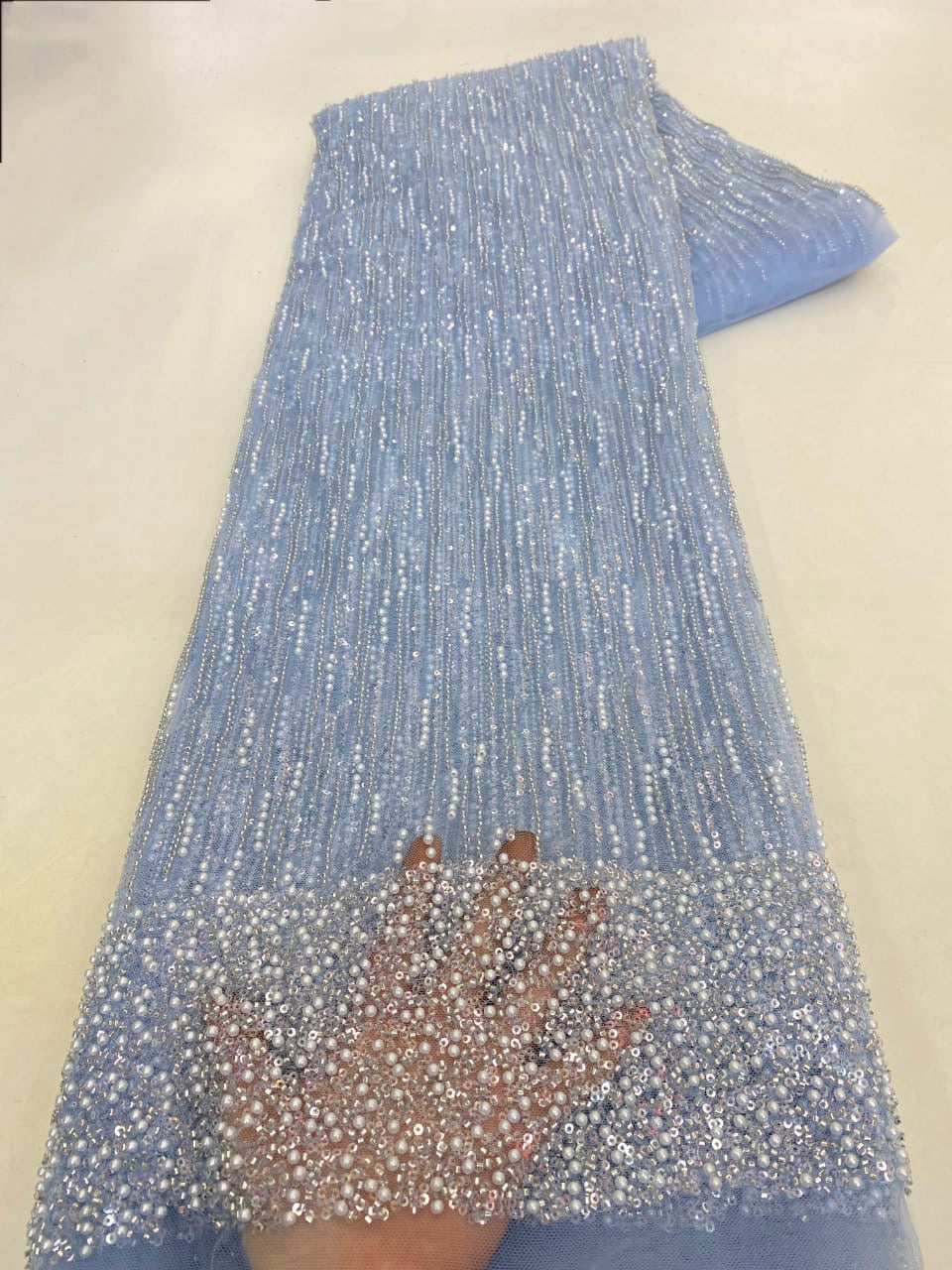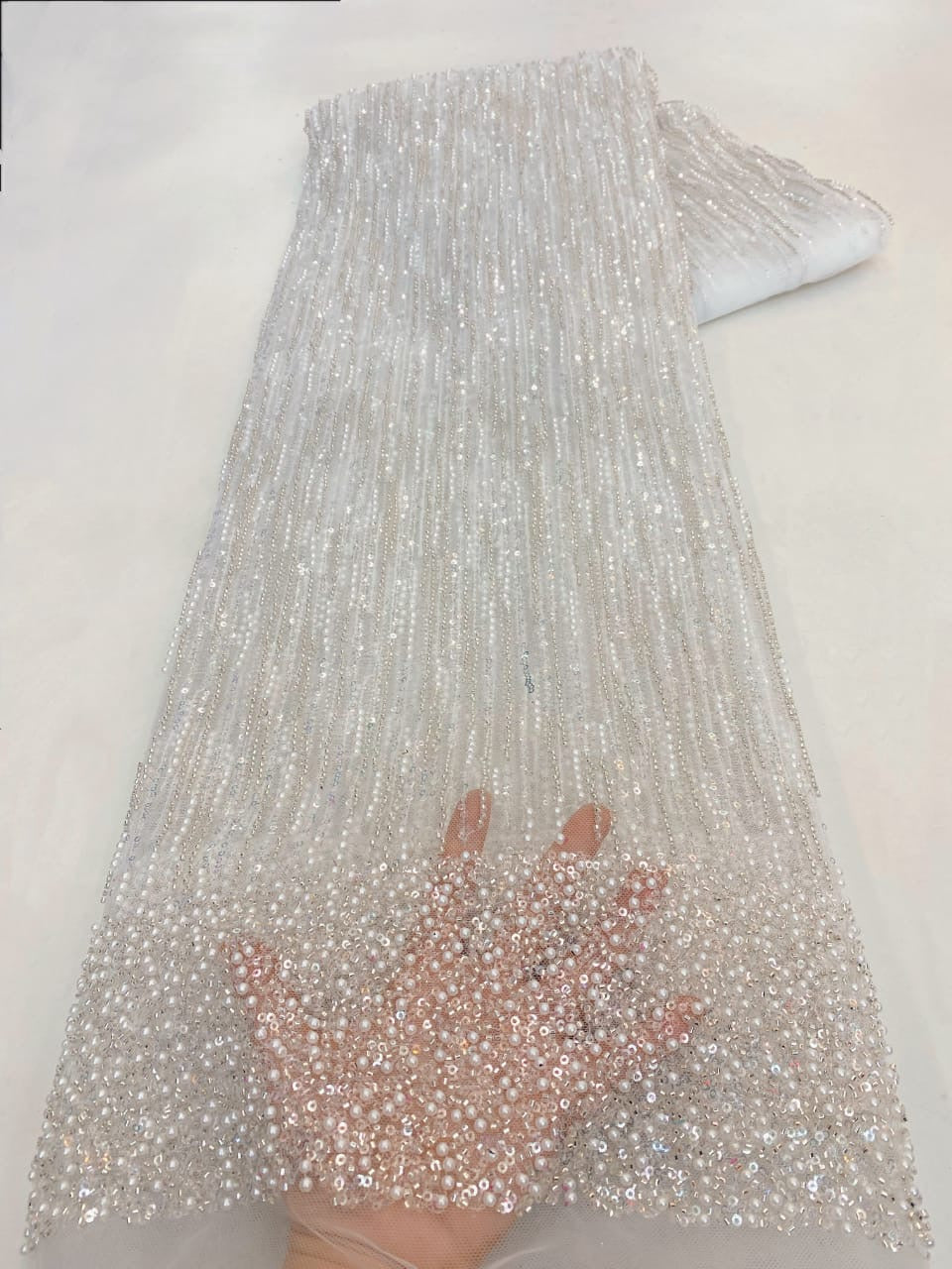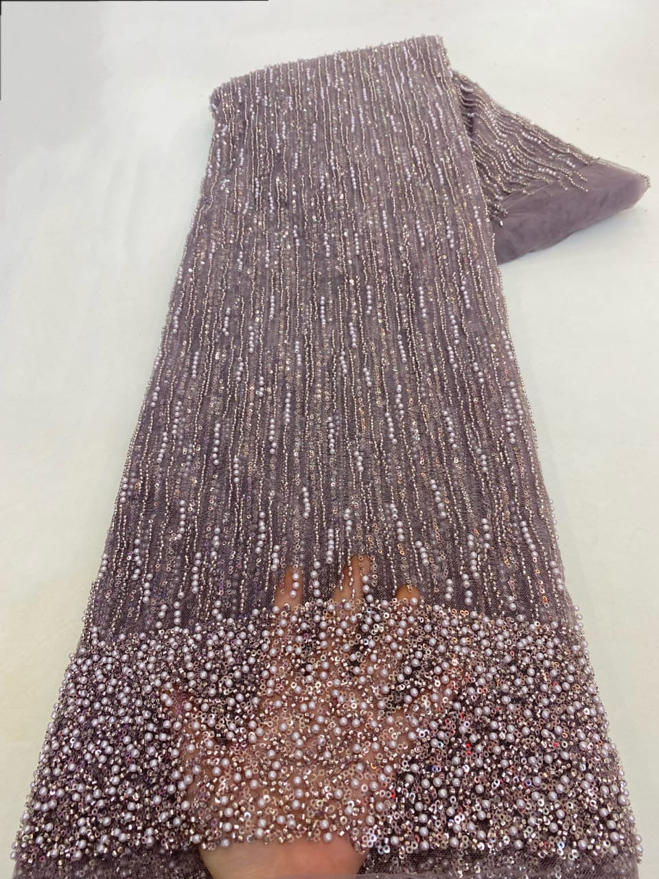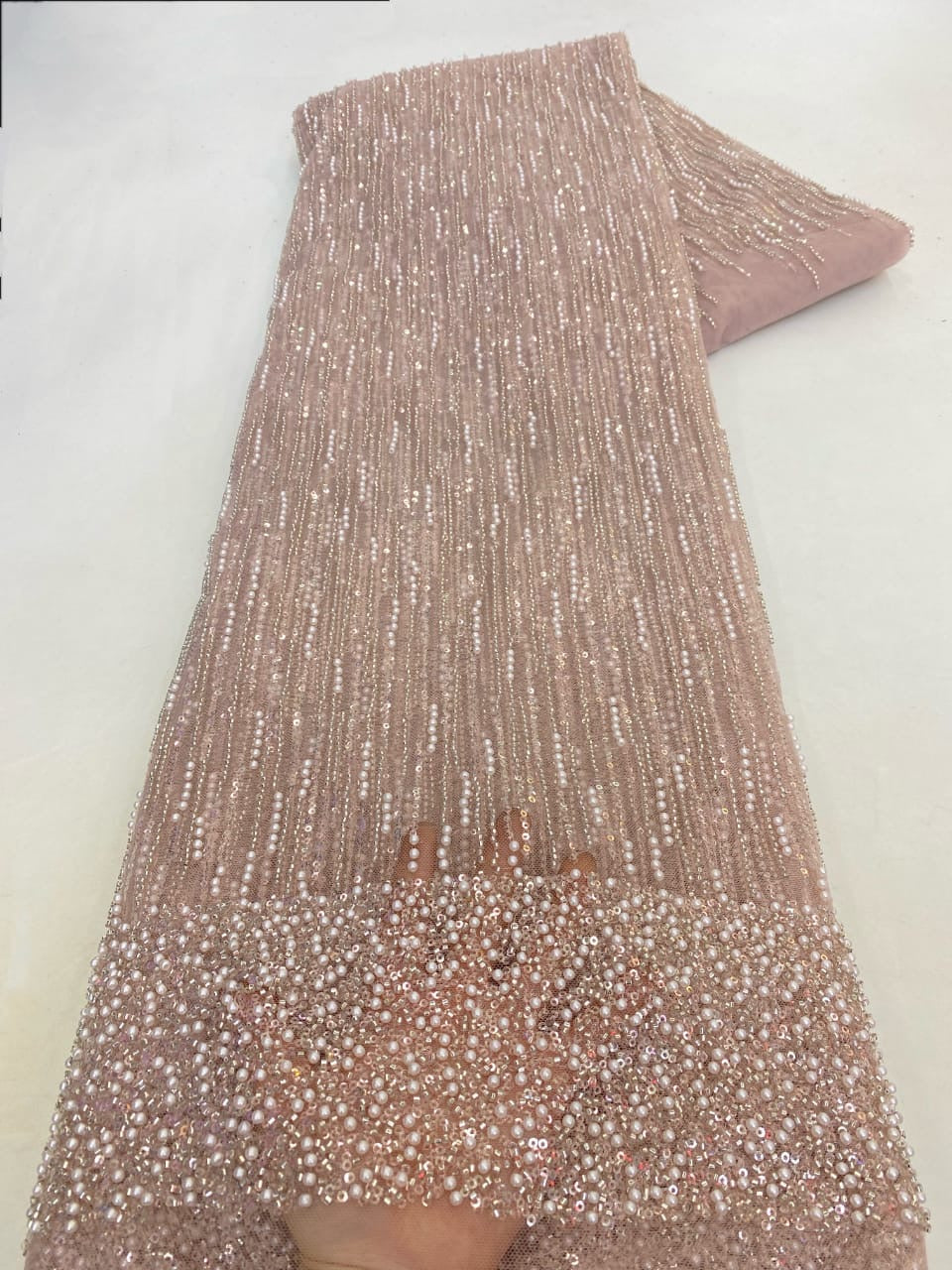 Esta tela de alta calidad se mide en 5 yardas con cuentas bordadas y lentejuelas. Es suave, muy delicado y bonito.