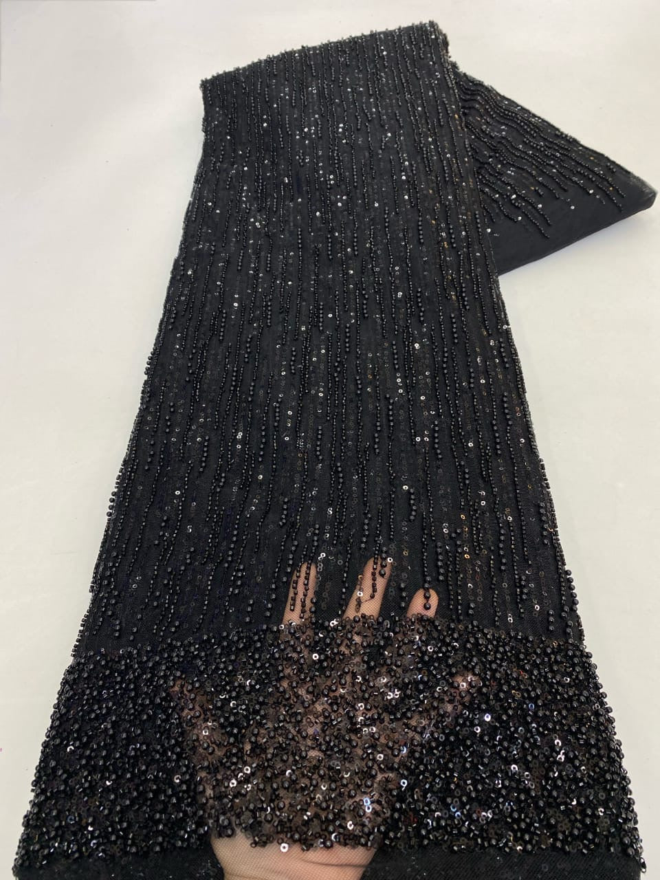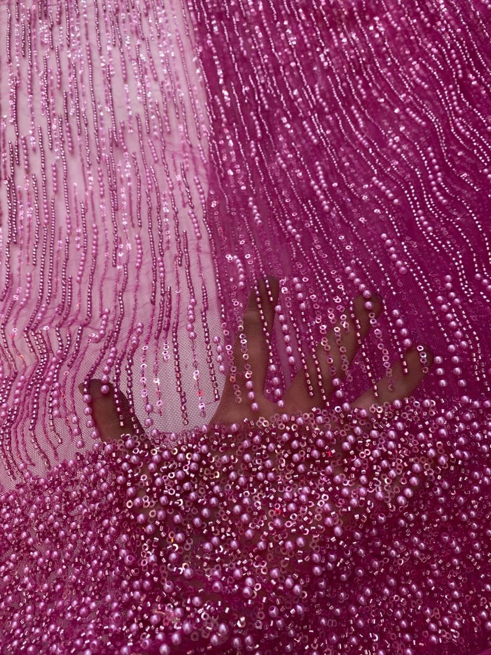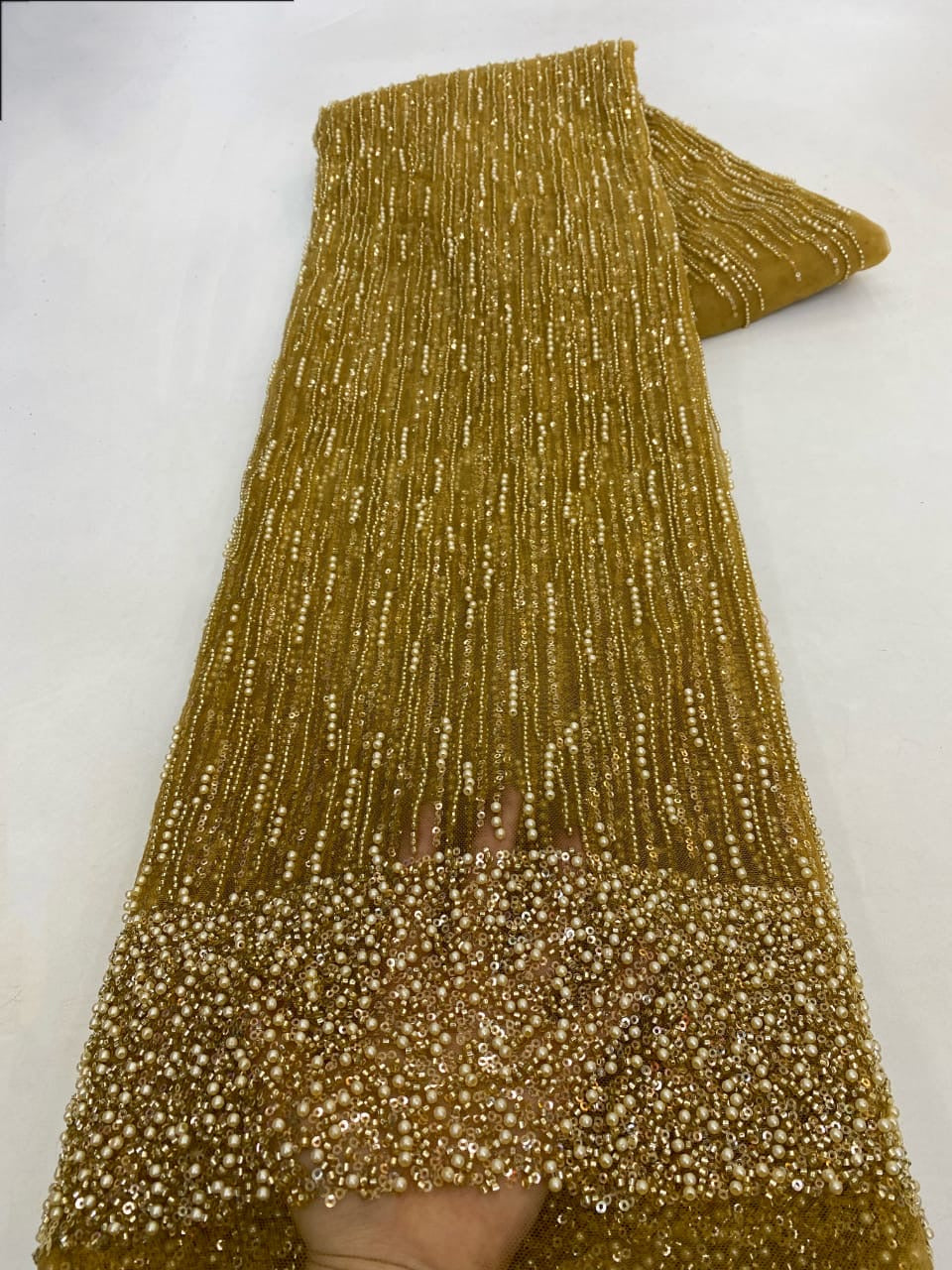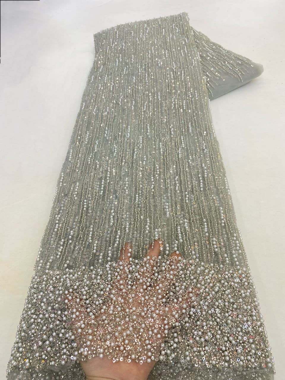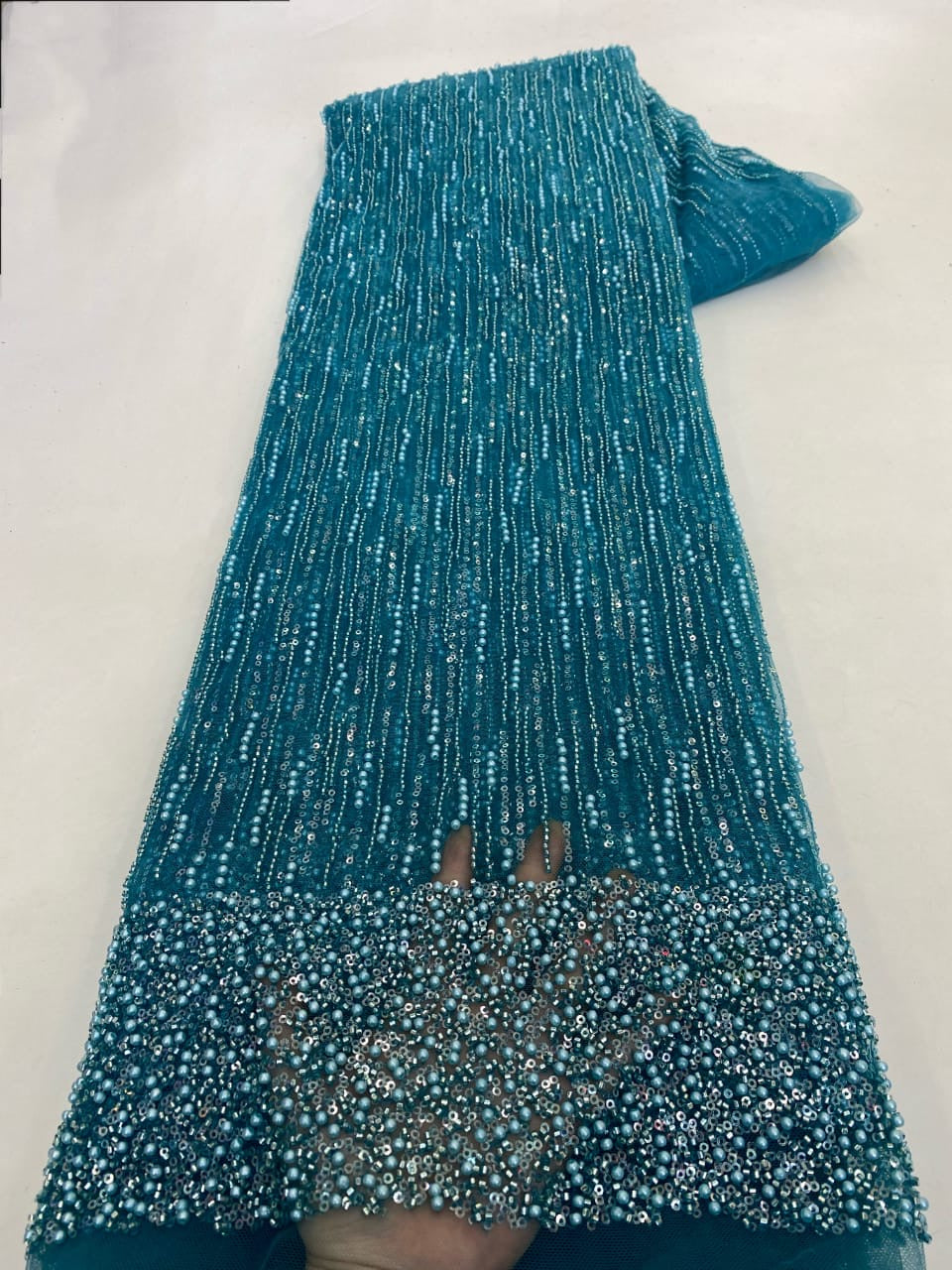Esta tela de alta calidad se mide en 5 yardas con cuentas bordadas y lentejuelas. Es suave, muy delicado y bonito.