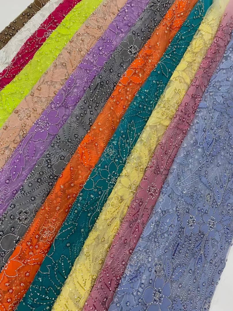 Esta tela de alta calidad está hecha con pedrería bordada a la moda y se puede usar para hacer vestidos de novia, faldas, chales, bufandas y otras prendas de moda que desee.