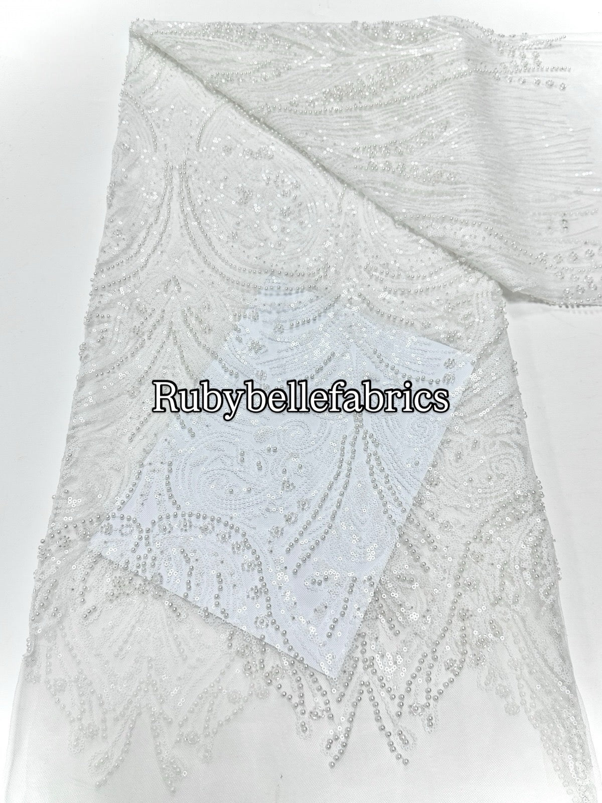 White Beaded Sequin Lace Fabric – Bridal Wedding Dress Lace, Luxury Embroidered Tulle