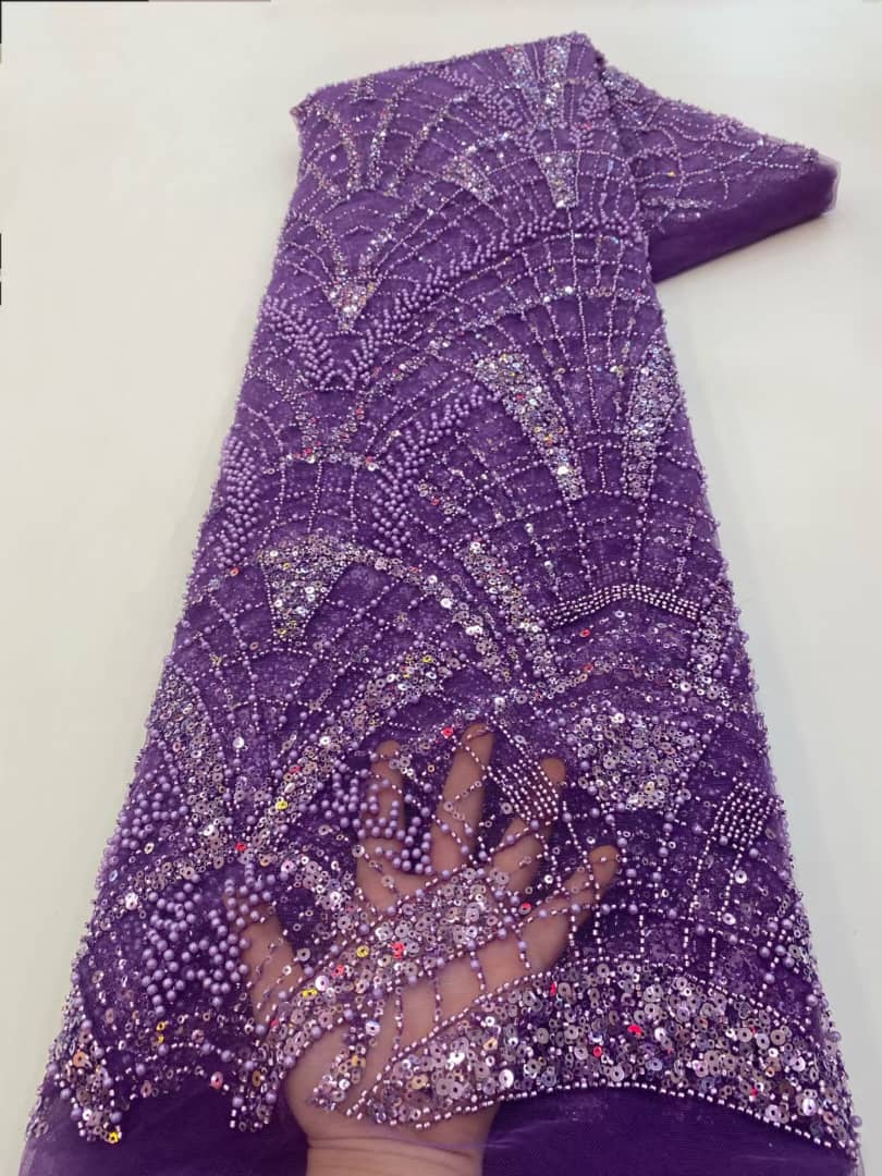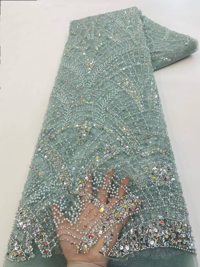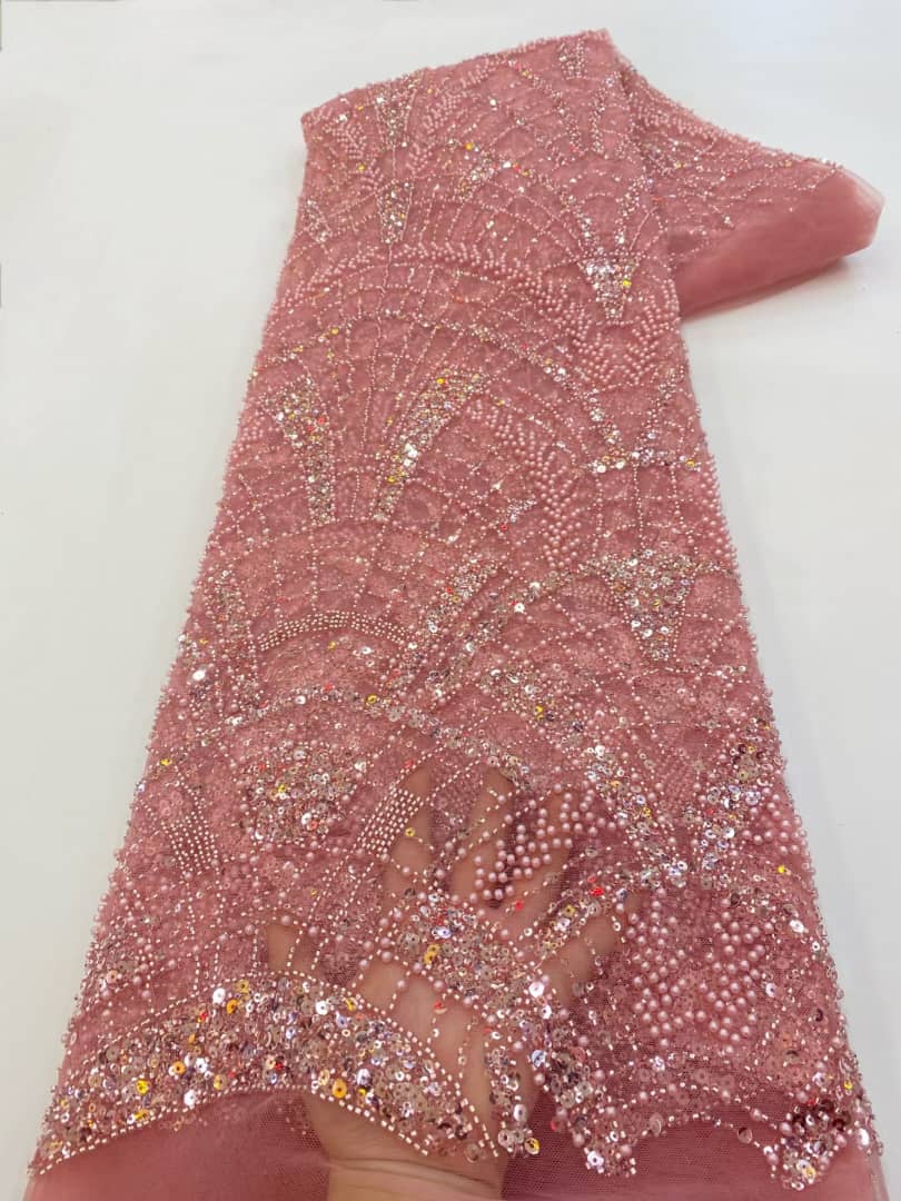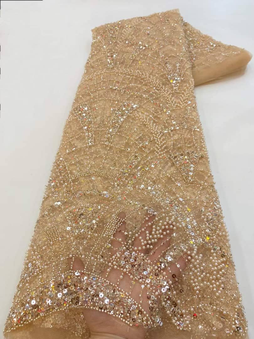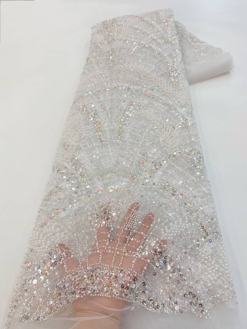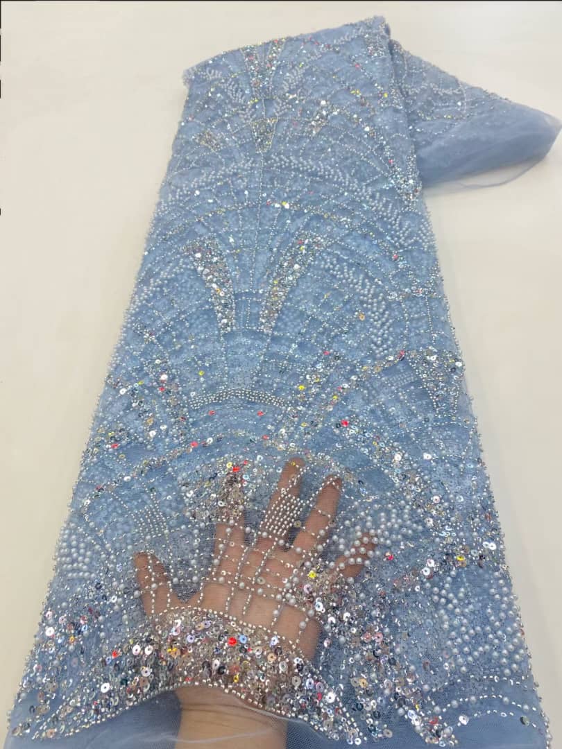 Esta tela de alta calidad se mide en 5 yardas con cuentas bordadas y lentejuelas. Es suave, muy delicado y bonito.