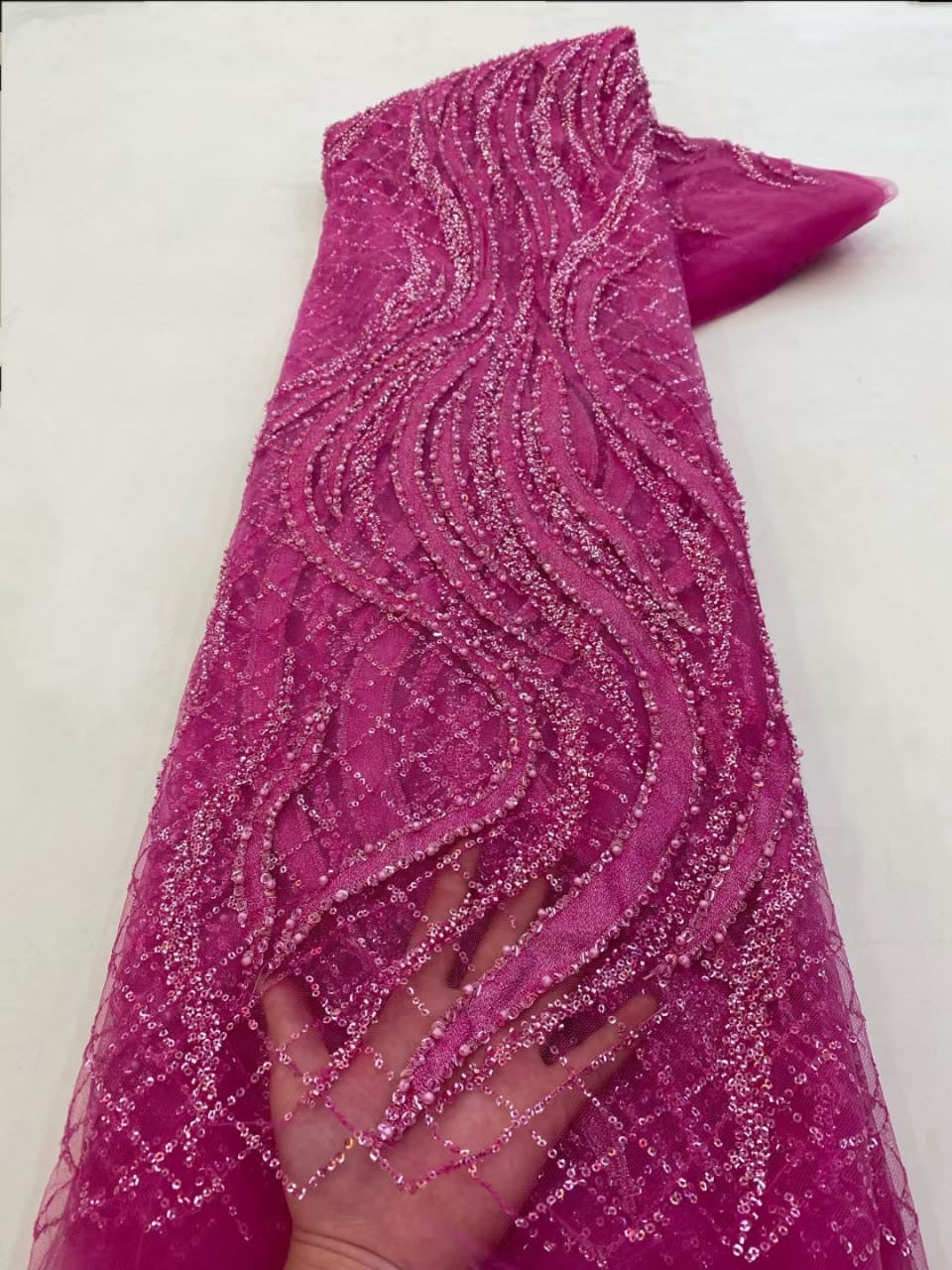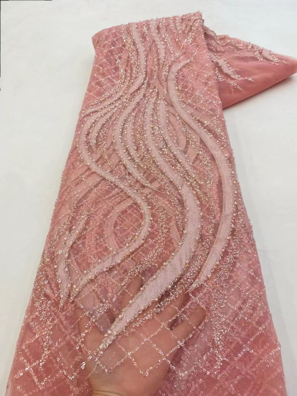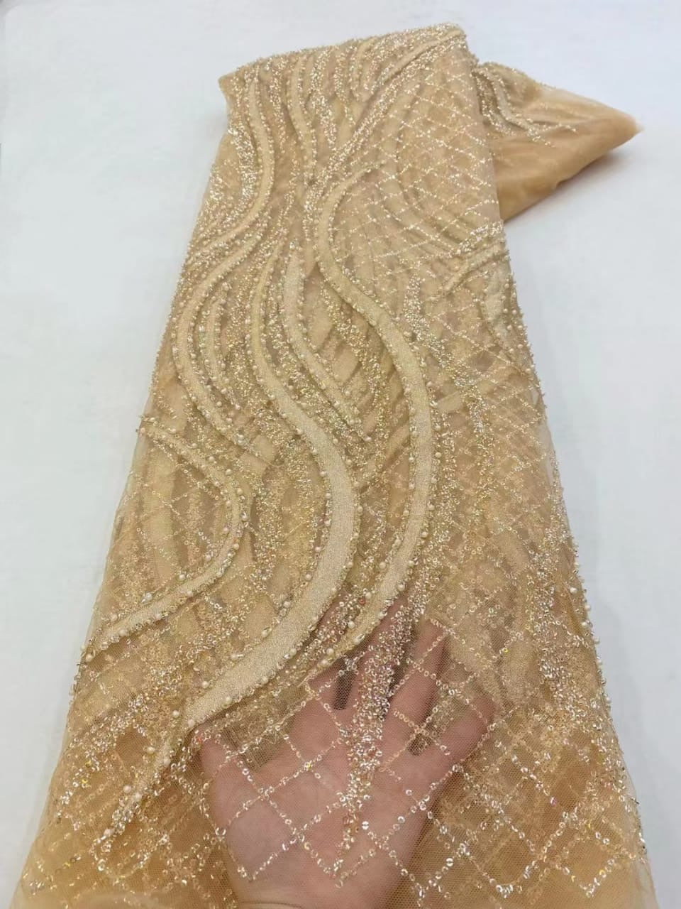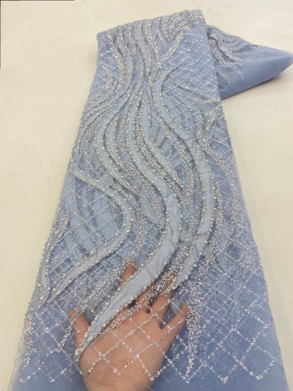 Esta tela de alta calidad se mide en 5 yardas con cuentas bordadas y lentejuelas. Es suave, muy delicado y bonito.