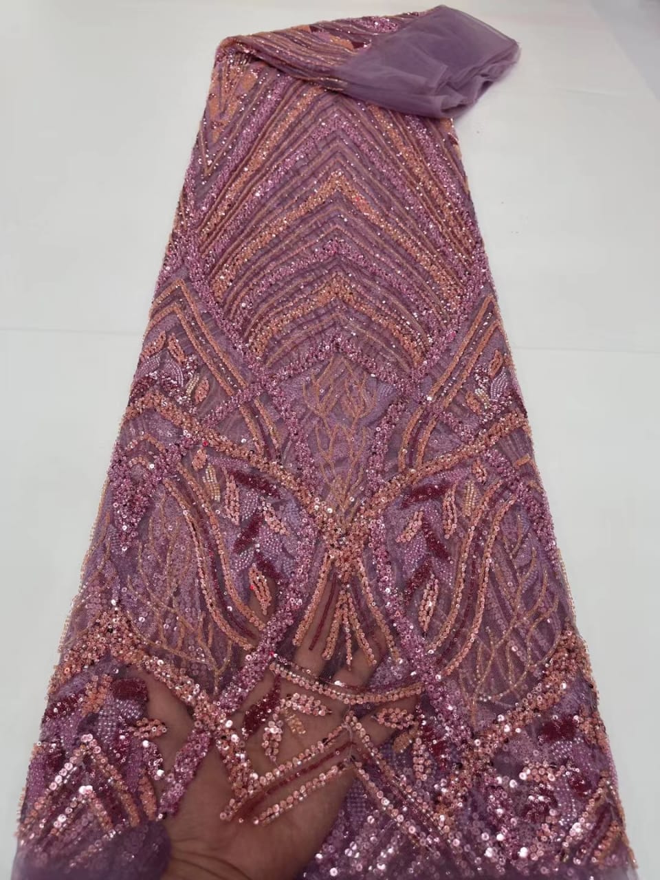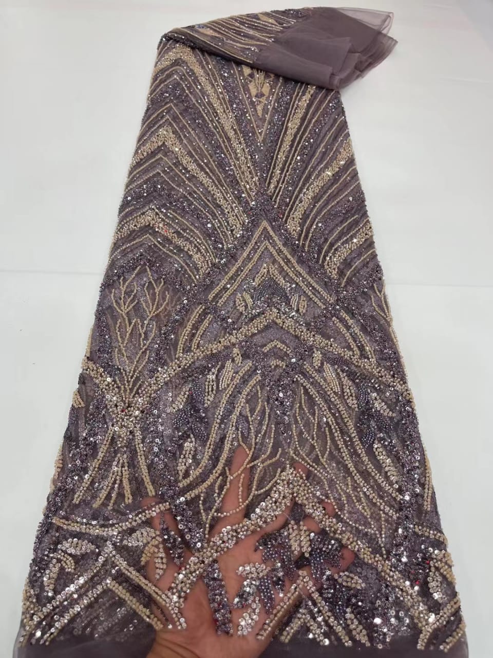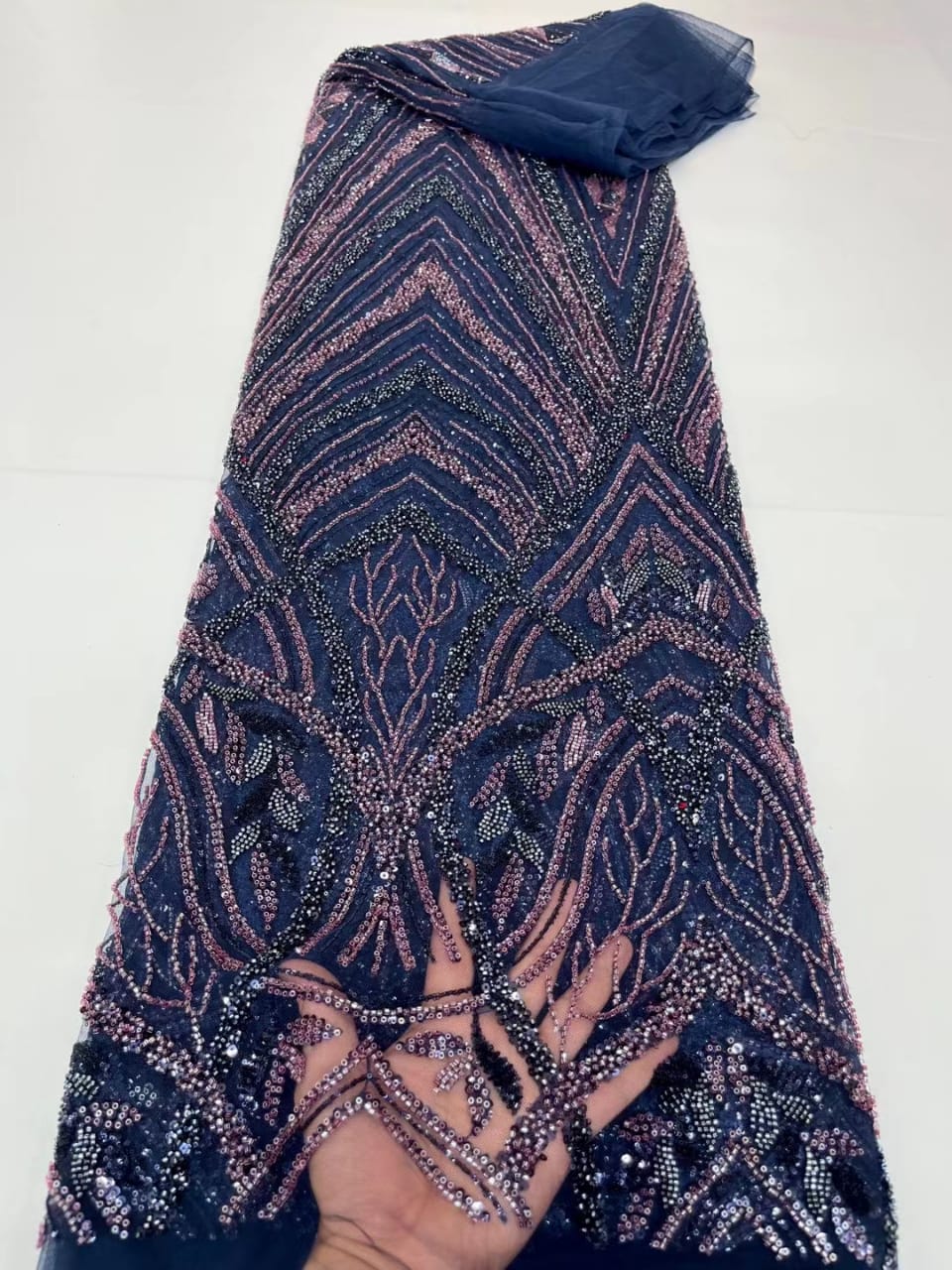 Esta tela de alta calidad se mide en 5 yardas con cuentas bordadas y lentejuelas. Es suave, muy delicado y bonito.