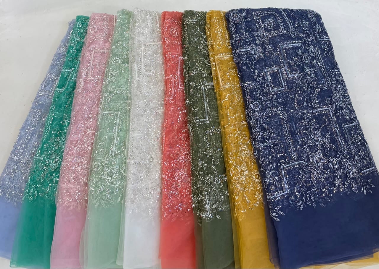 Esta tela de alta calidad está hecha con pedrería bordada a la moda y se puede usar para hacer vestidos de novia, faldas, chales, bufandas y otras prendas de moda que desee.