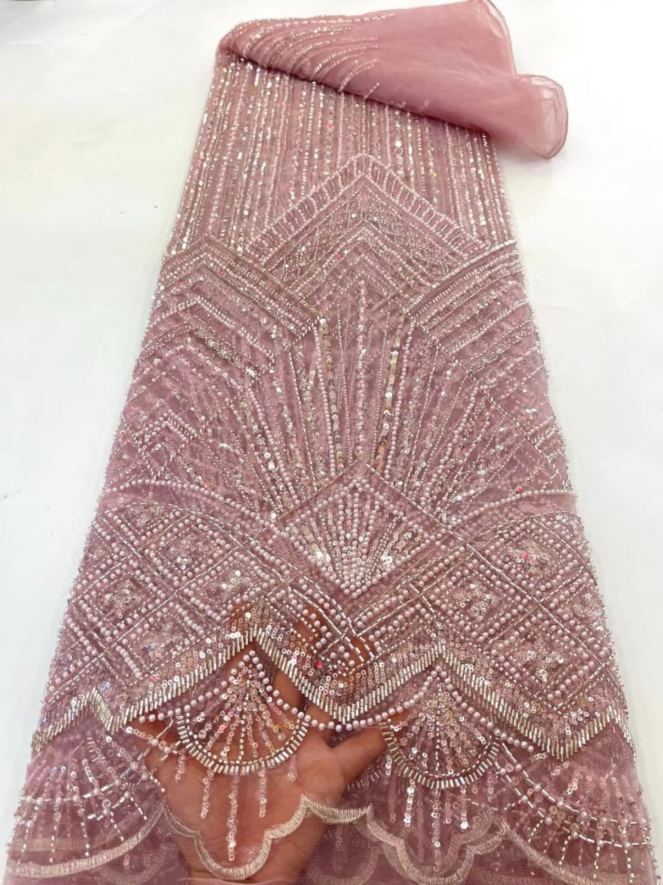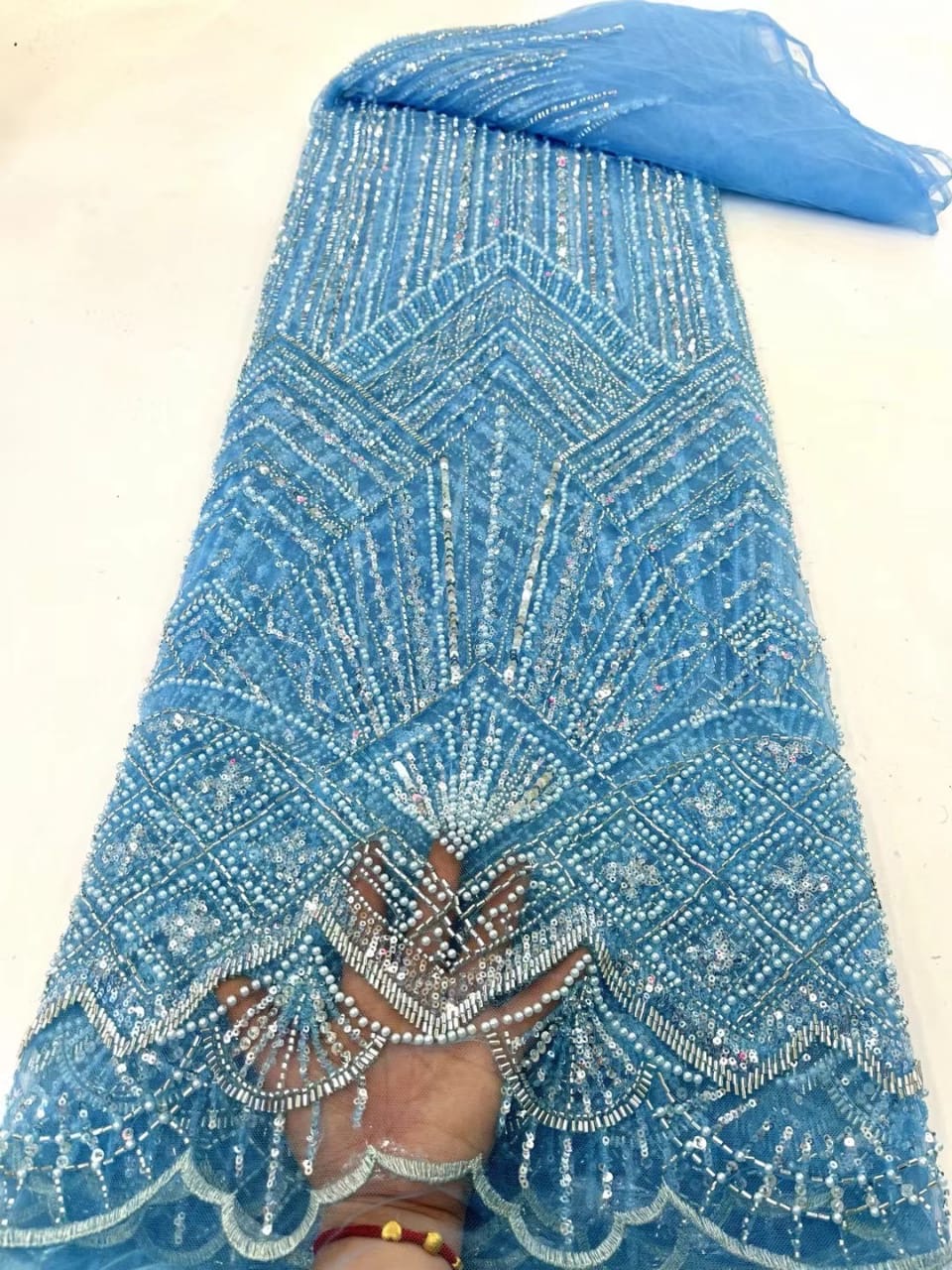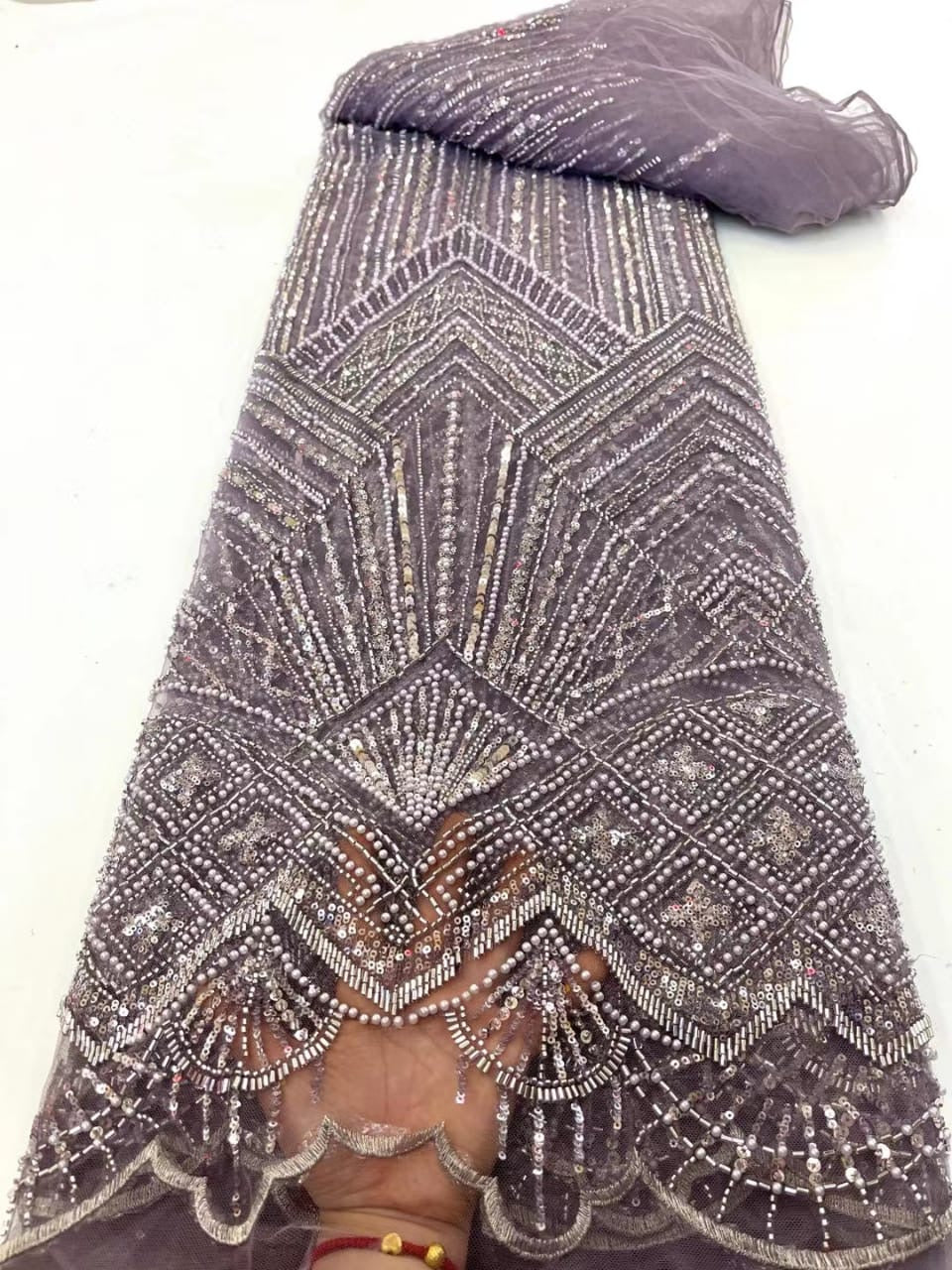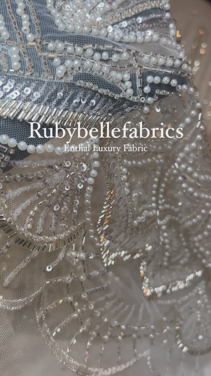 Esta tela de alta calidad se mide en 5 yardas con cuentas bordadas y lentejuelas. Es suave, muy delicado y bonito.