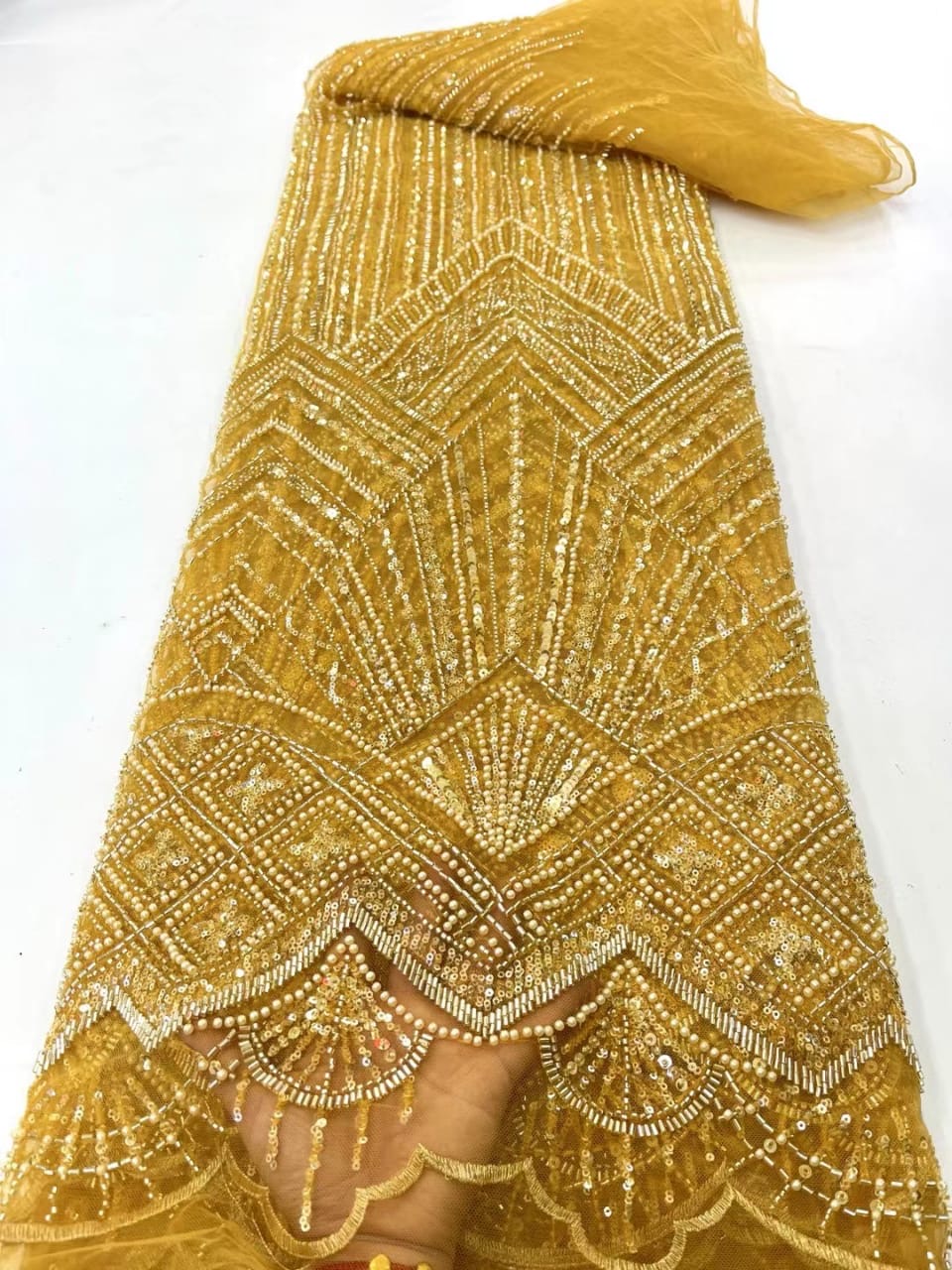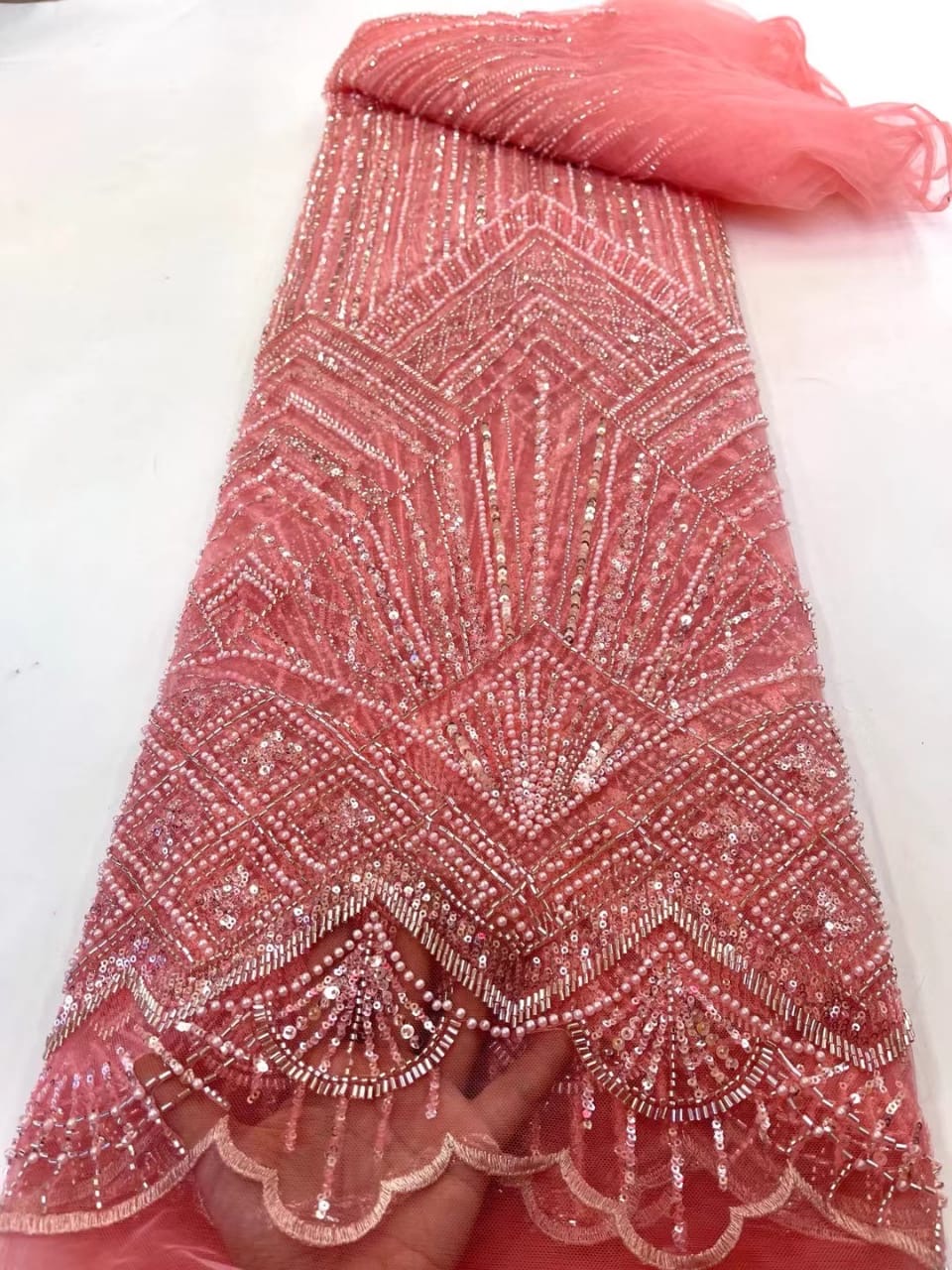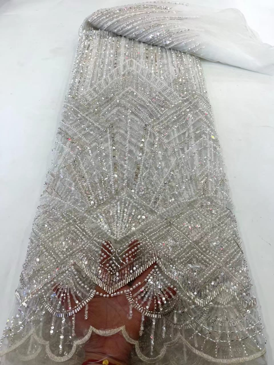 Esta tela de alta calidad está hecha con pedrería bordada a la moda y se puede usar para hacer vestidos de novia, faldas, chales, bufandas y otras prendas de moda que desee.