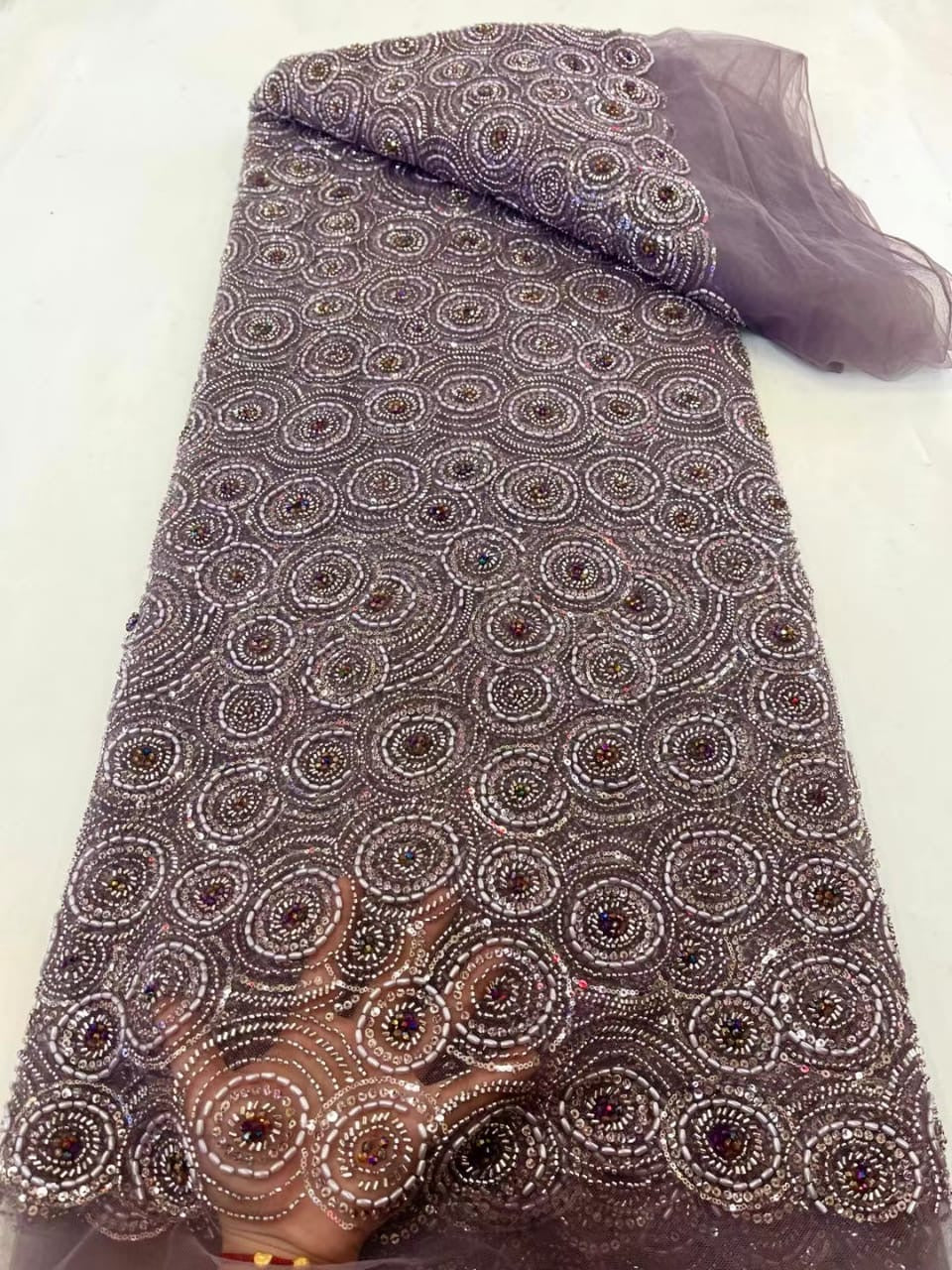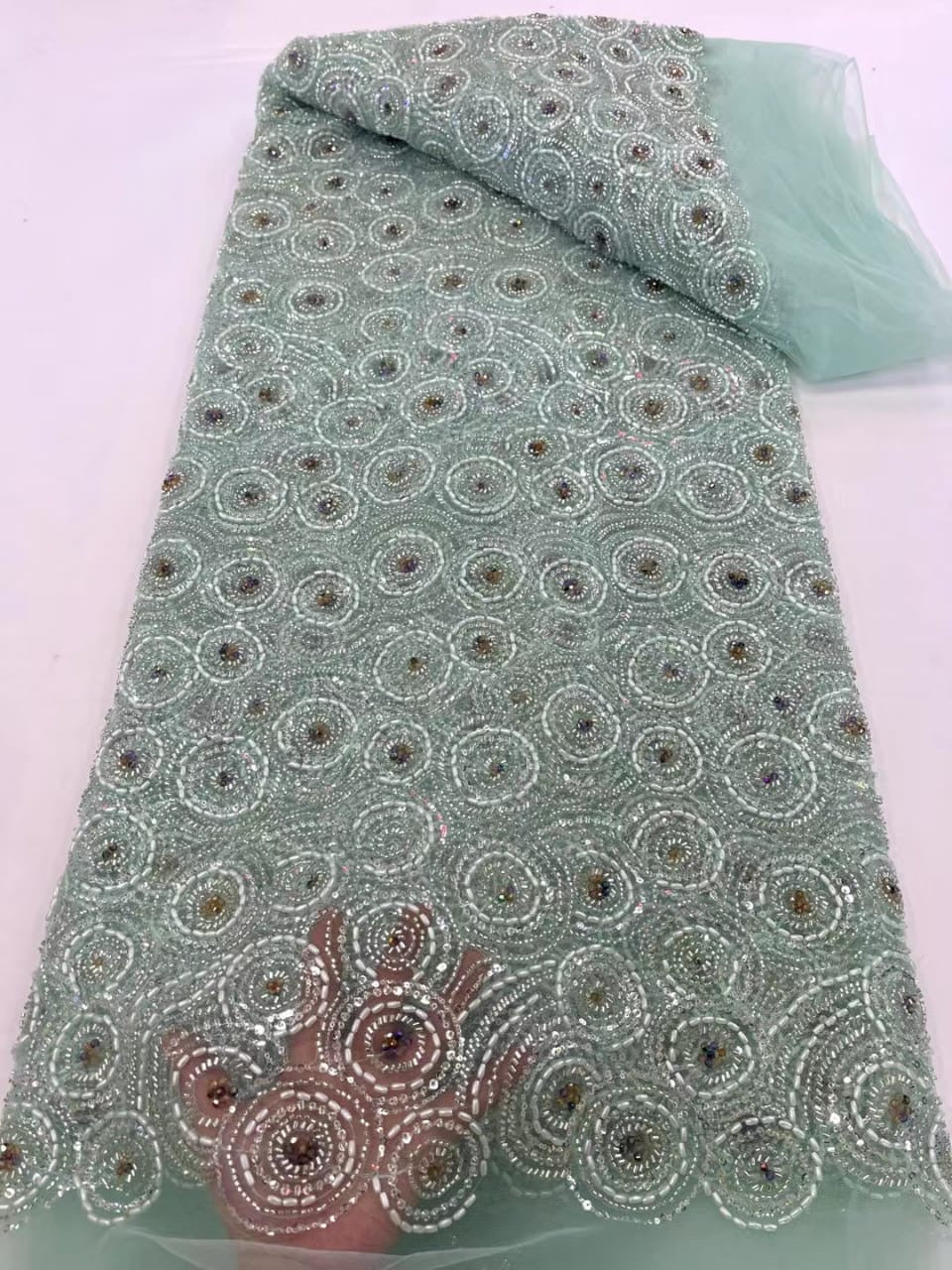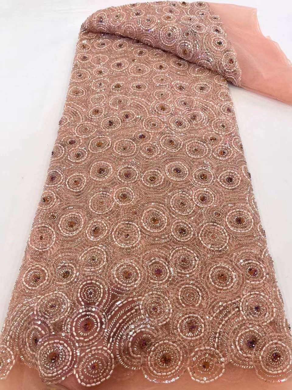 Esta tela de alta calidad se mide en 5 yardas con cuentas bordadas y lentejuelas. Es suave, muy delicado y bonito.