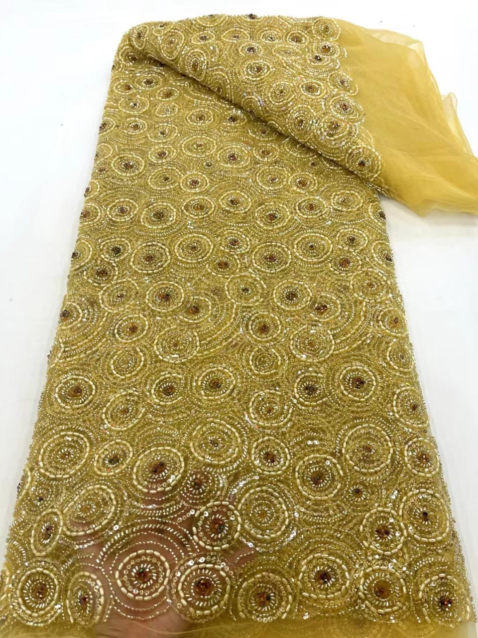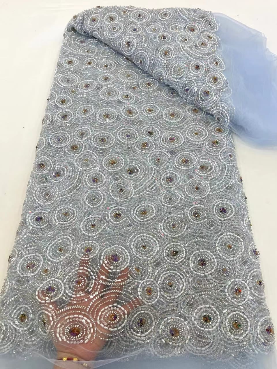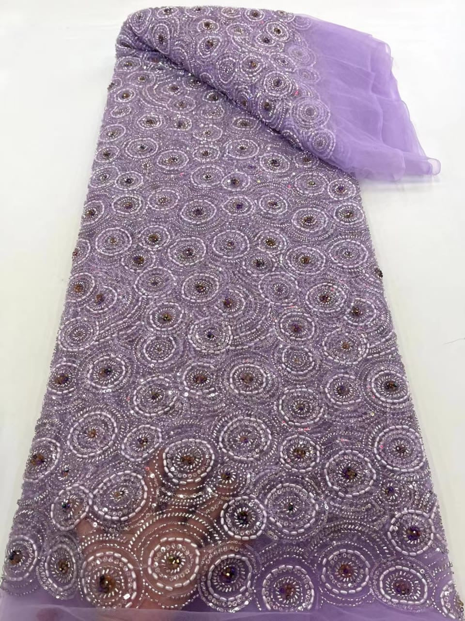 Esta tela de alta calidad se mide en 5 yardas con cuentas bordadas y lentejuelas. Es suave, muy delicado y bonito.