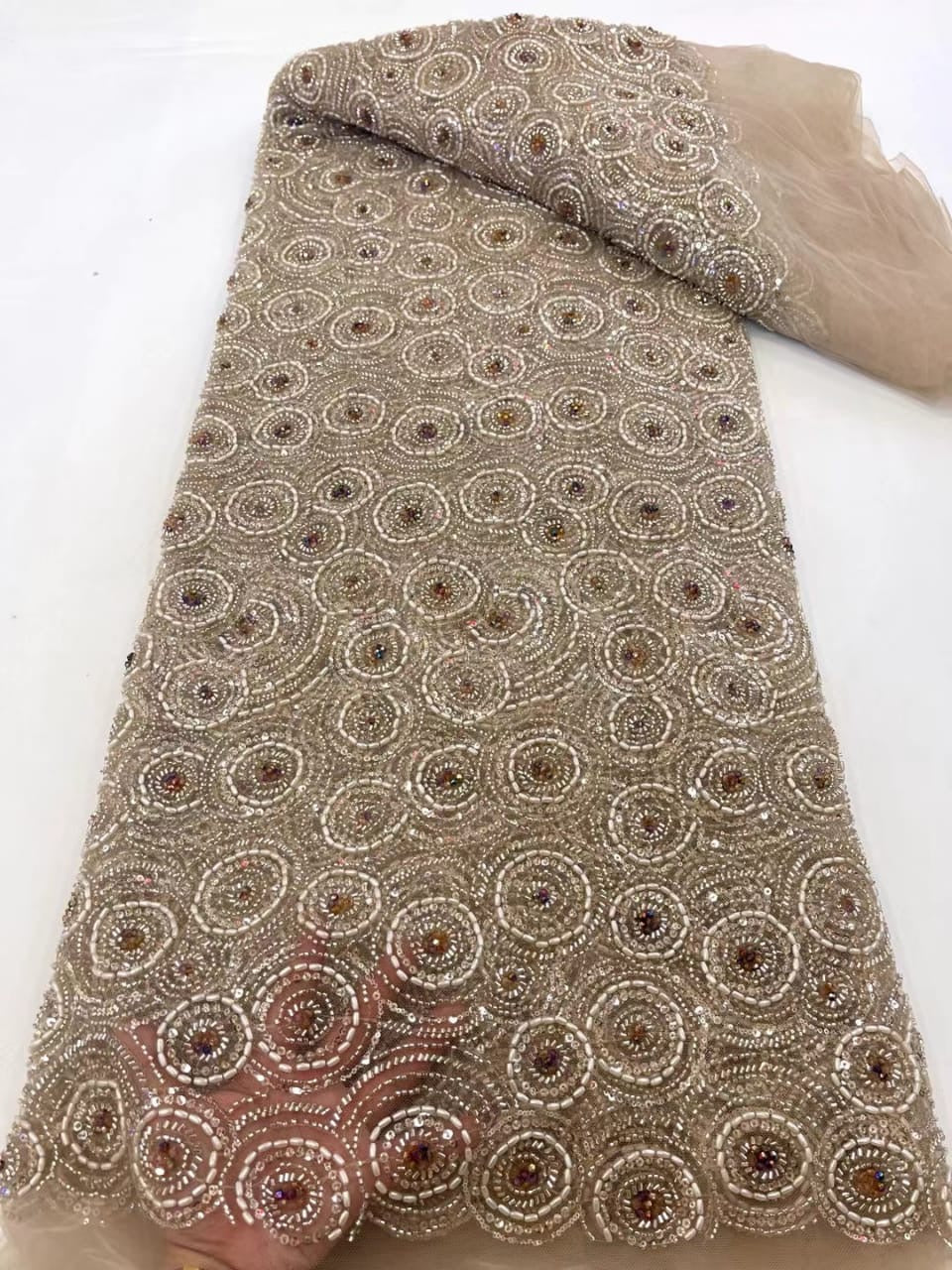 Esta tela de alta calidad está hecha con pedrería bordada a la moda y se puede usar para hacer vestidos de novia, faldas, chales, bufandas y otras prendas de moda que desee.