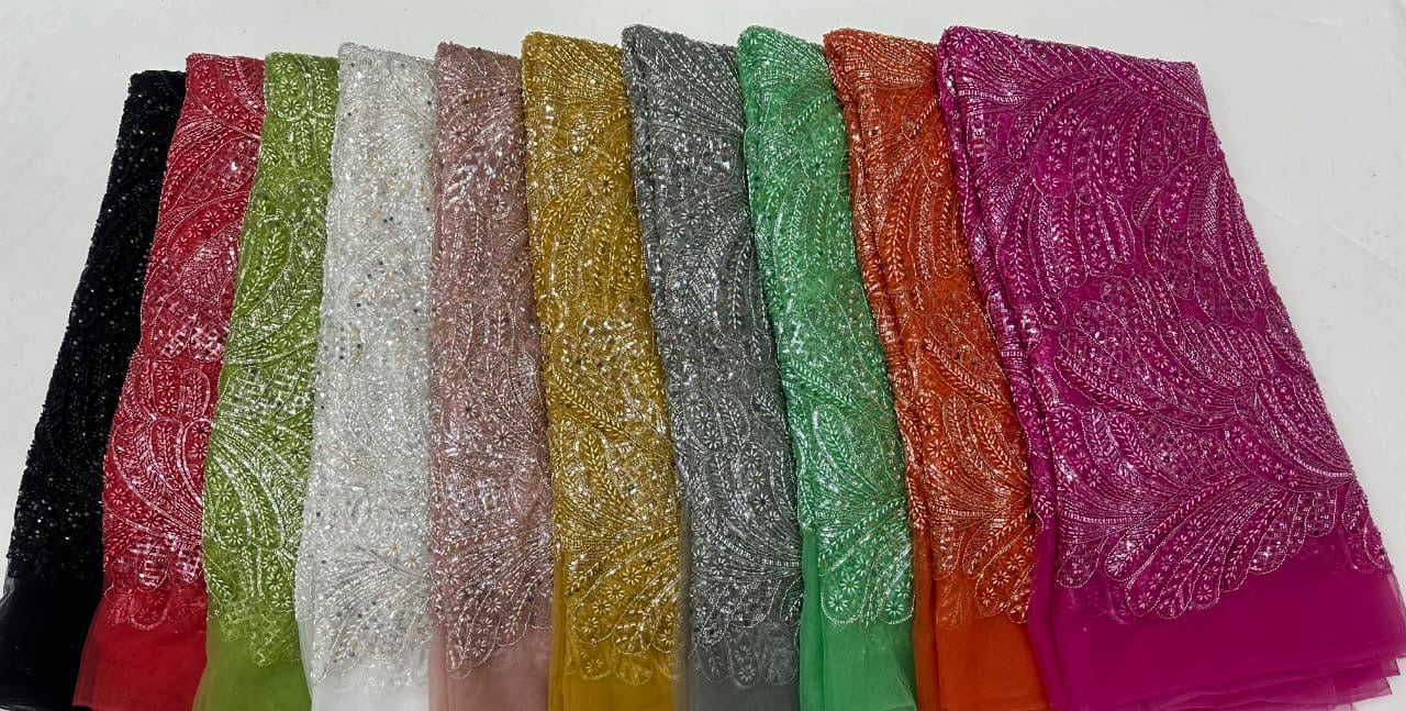 Esta tela de alta calidad está hecha con pedrería bordada a la moda y se puede usar para hacer vestidos de novia, faldas, chales, bufandas y otras prendas de moda que desee.