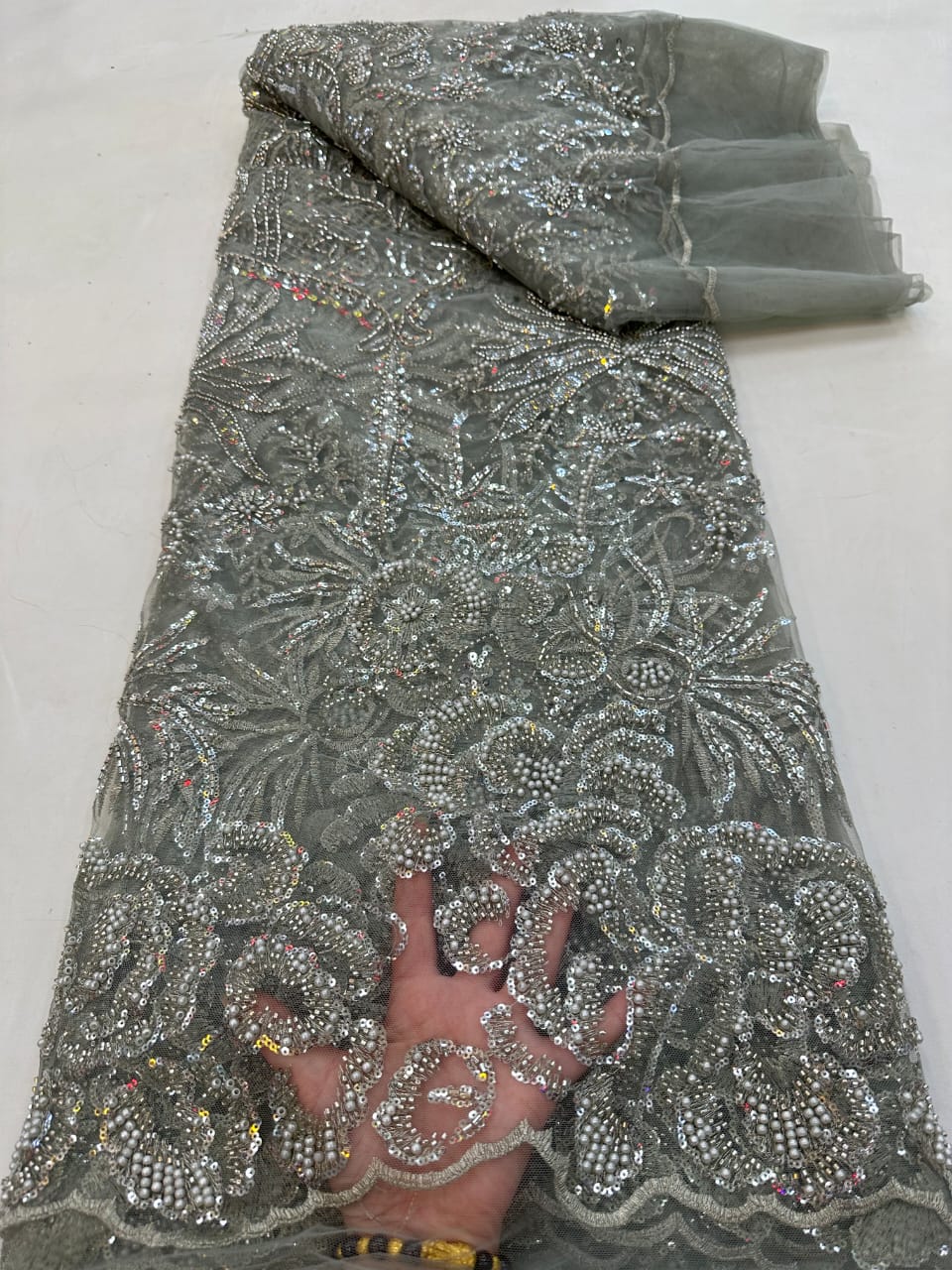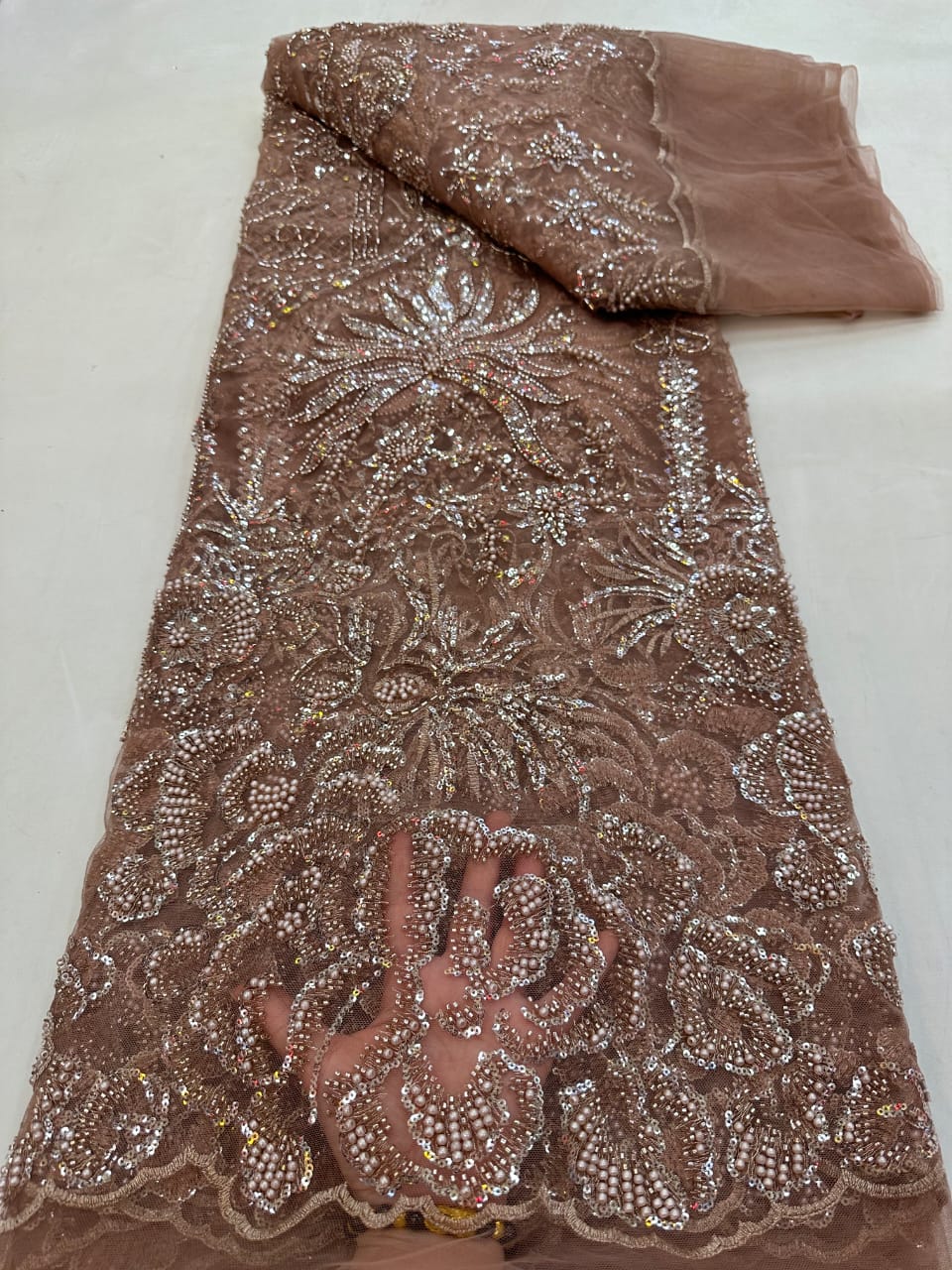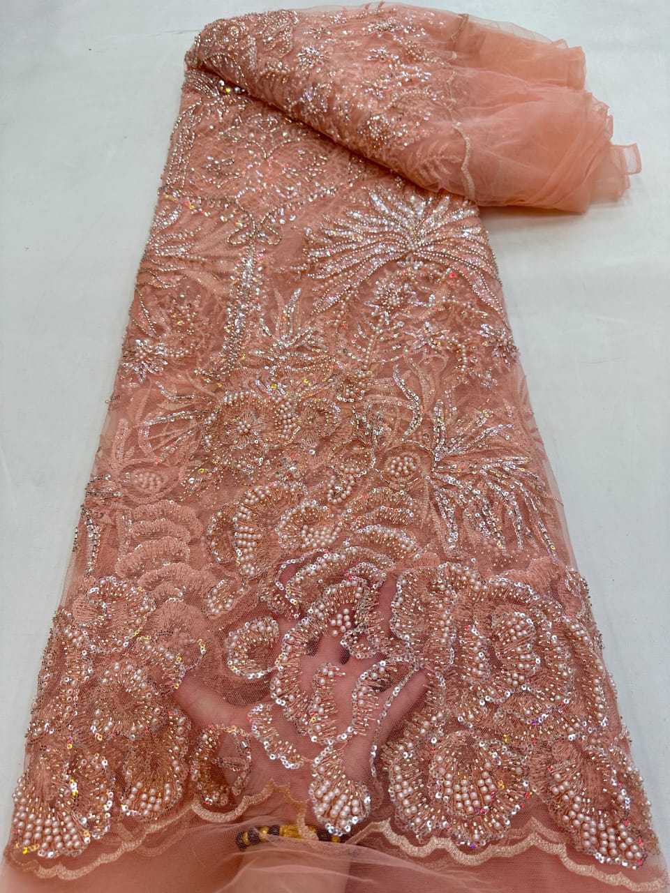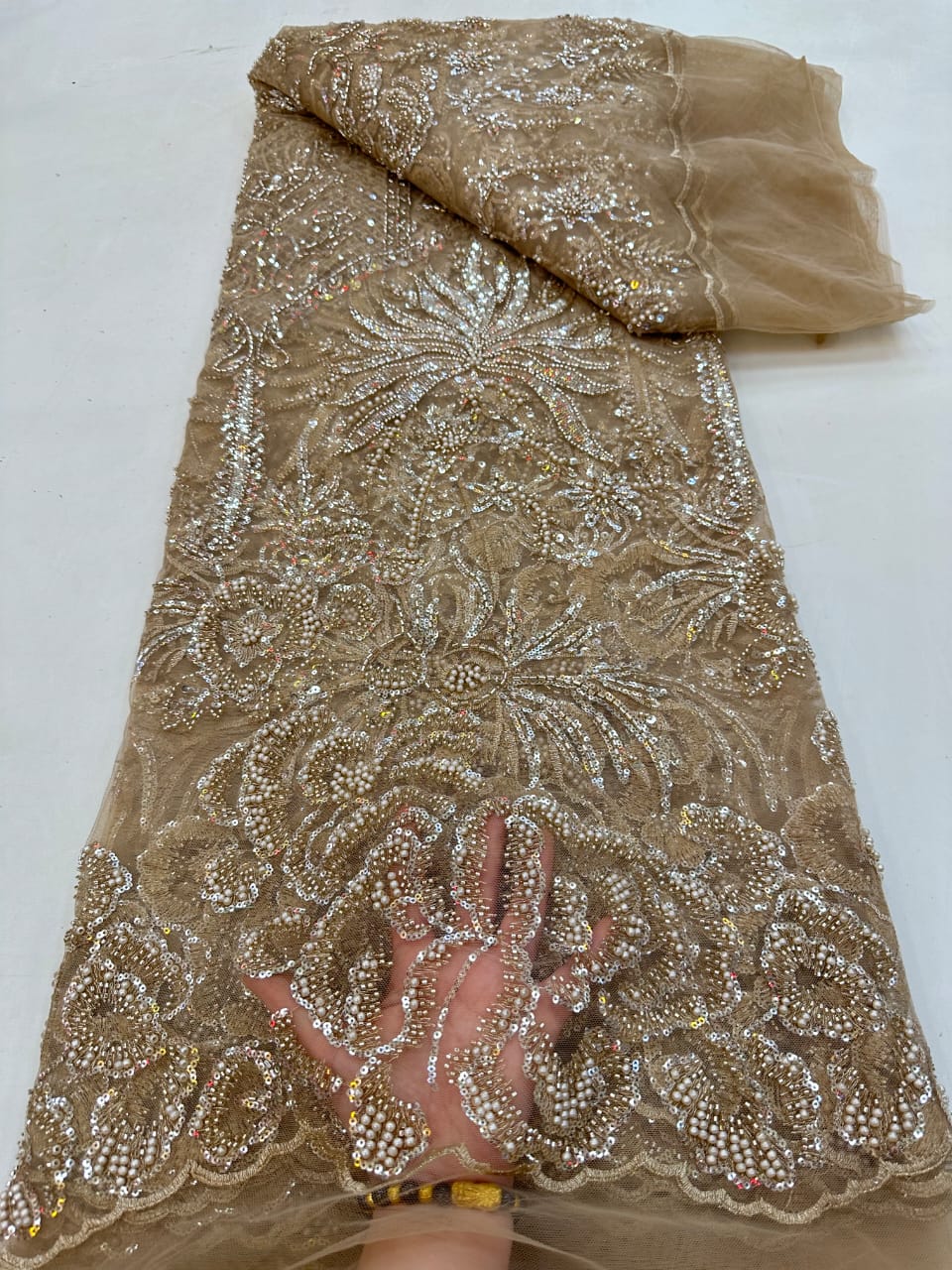 Esta tela de alta calidad se mide en 5 yardas con cuentas bordadas y lentejuelas. Es suave, muy delicado y bonito.