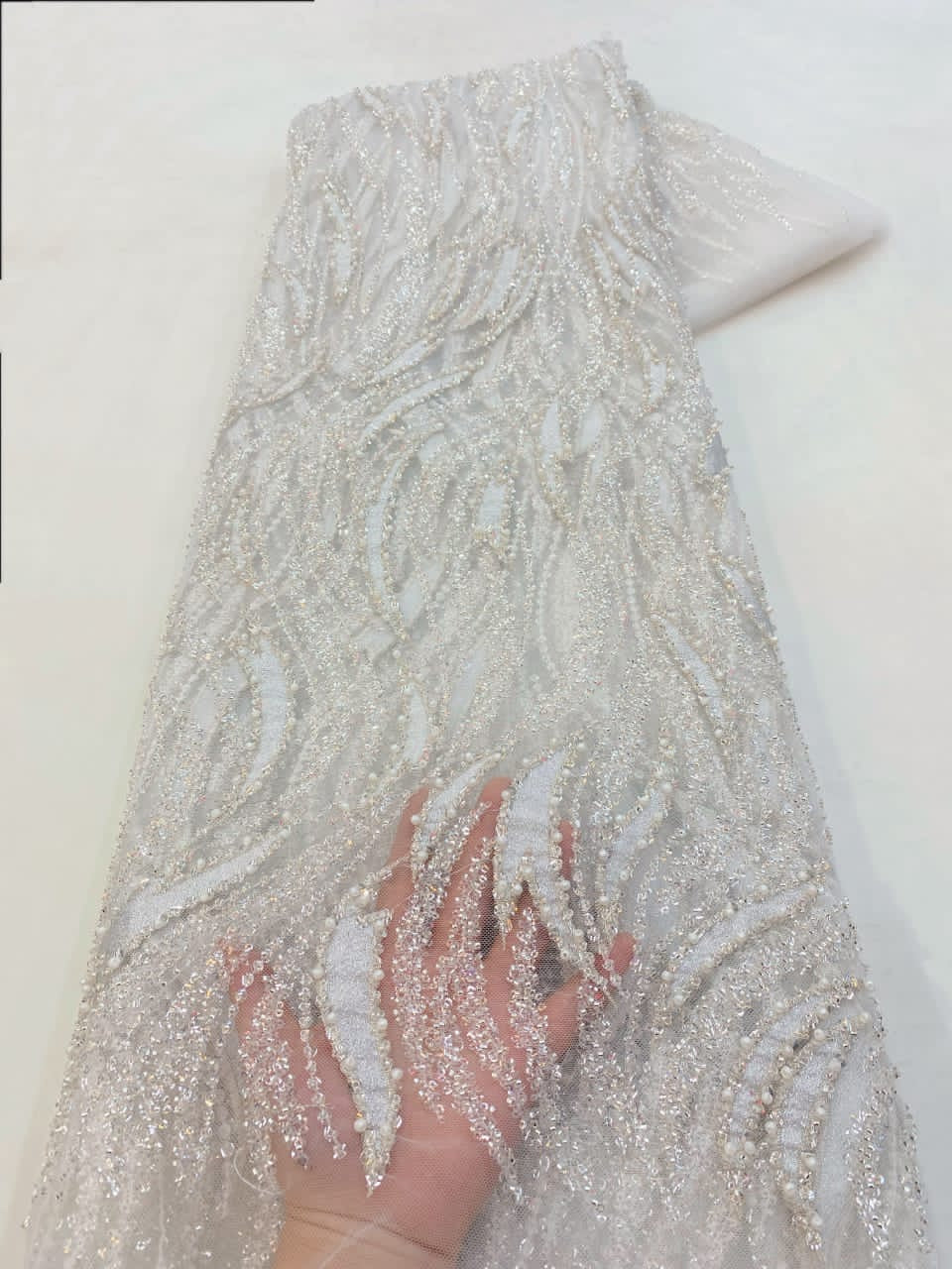 Esta tela de alta calidad está hecha con pedrería bordada a la moda y se puede usar para hacer vestidos de novia, faldas, chales, bufandas y otras prendas de moda que desee.