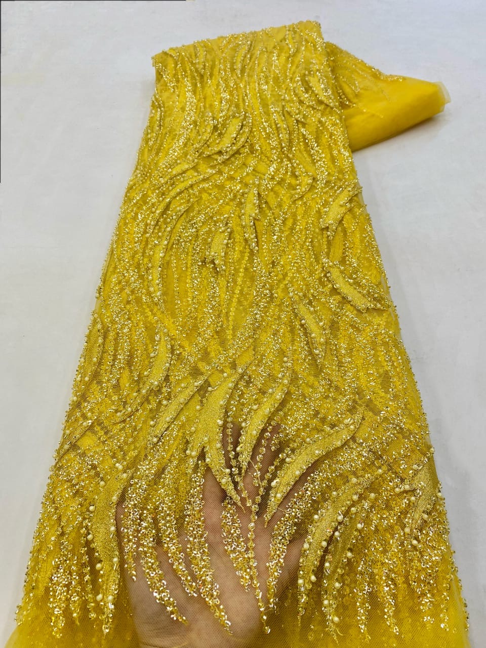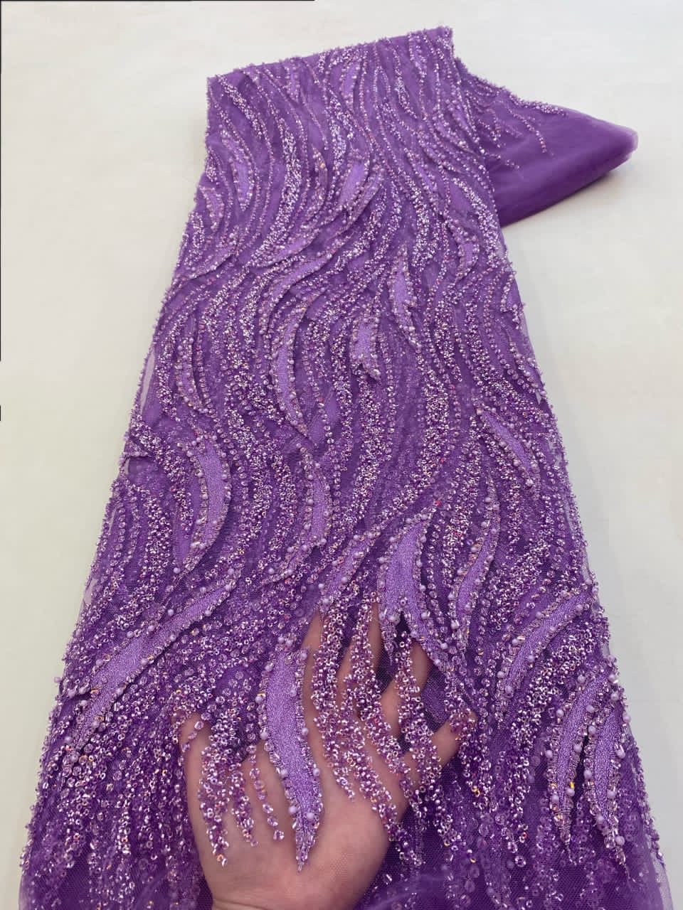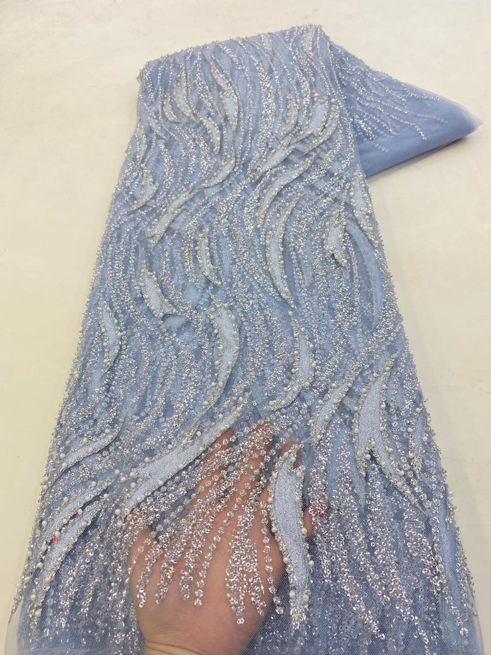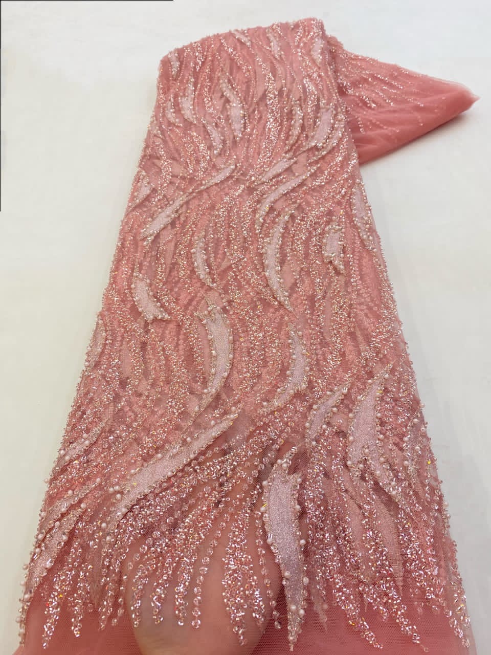 Esta tela de alta calidad se mide en 5 yardas con cuentas bordadas y lentejuelas. Es suave, muy delicado y bonito.