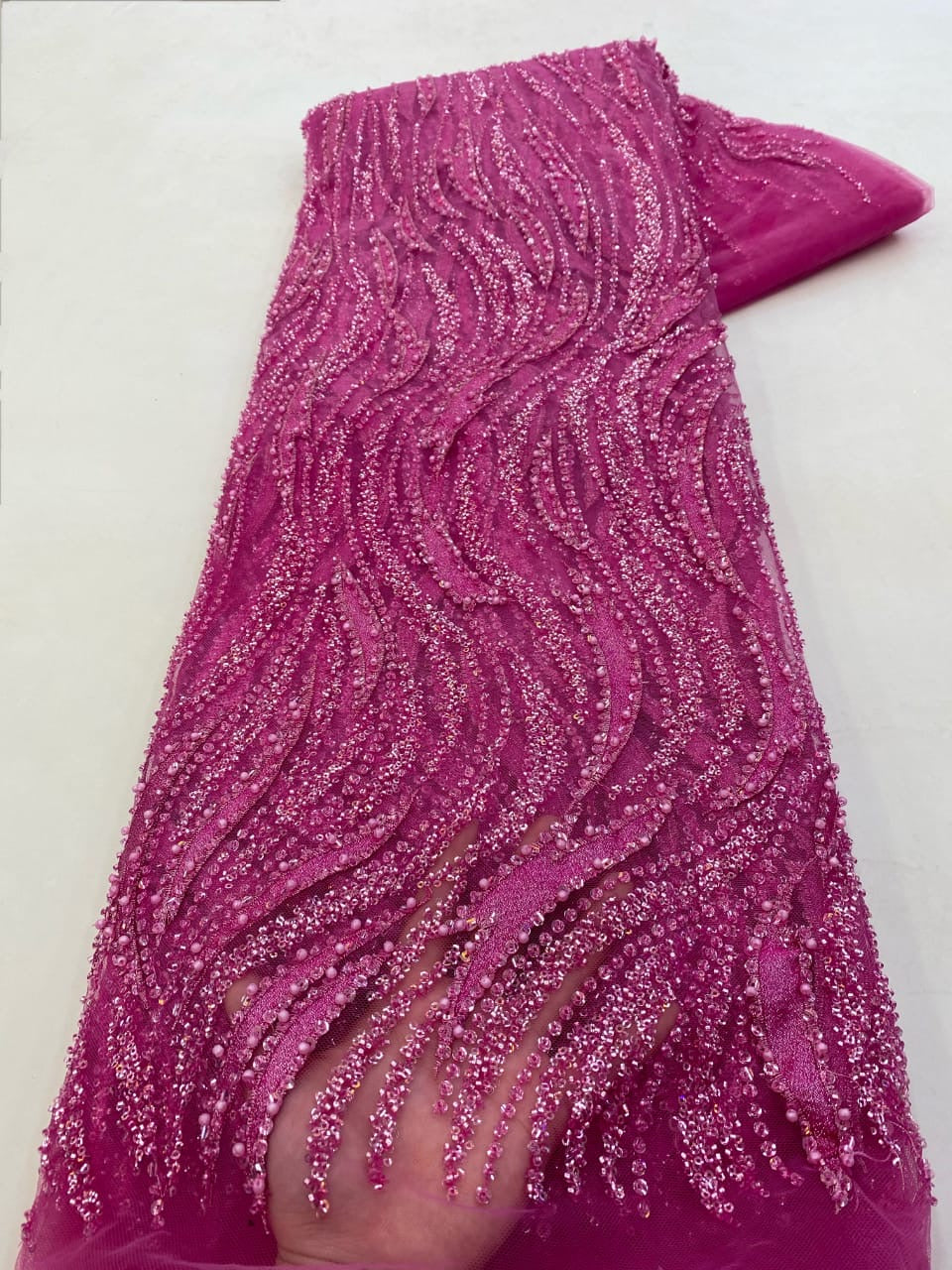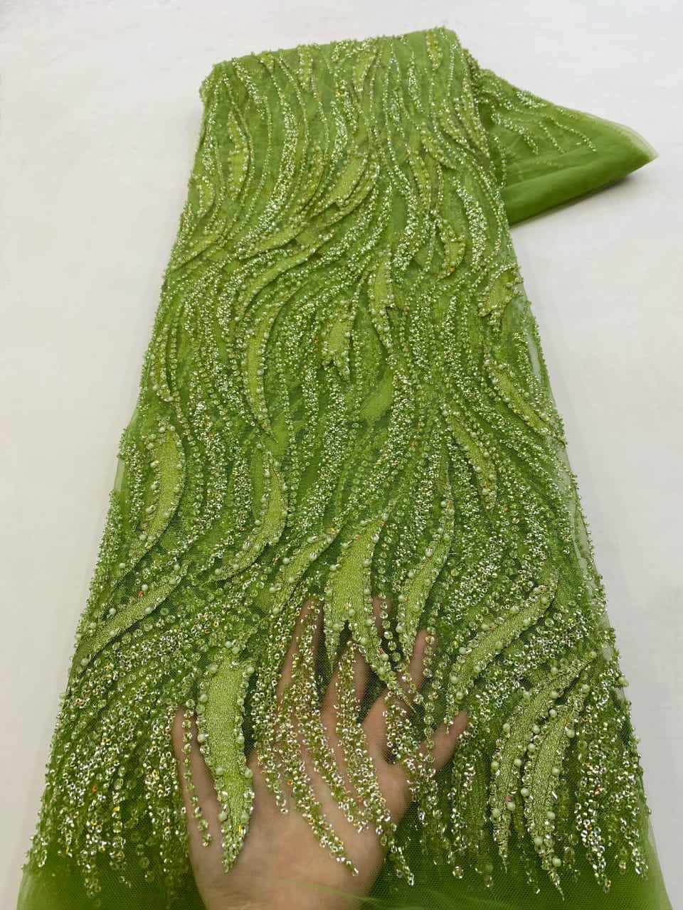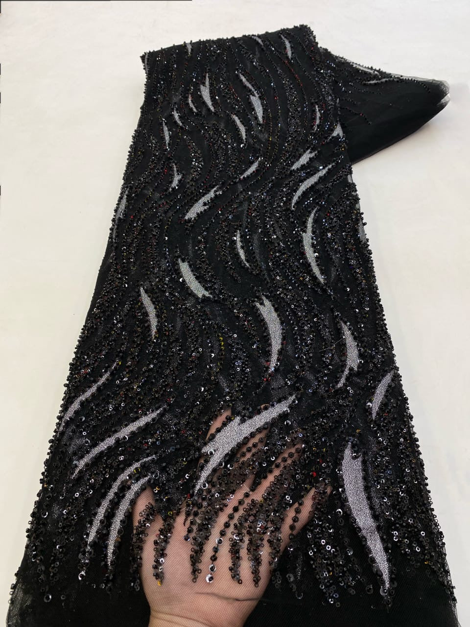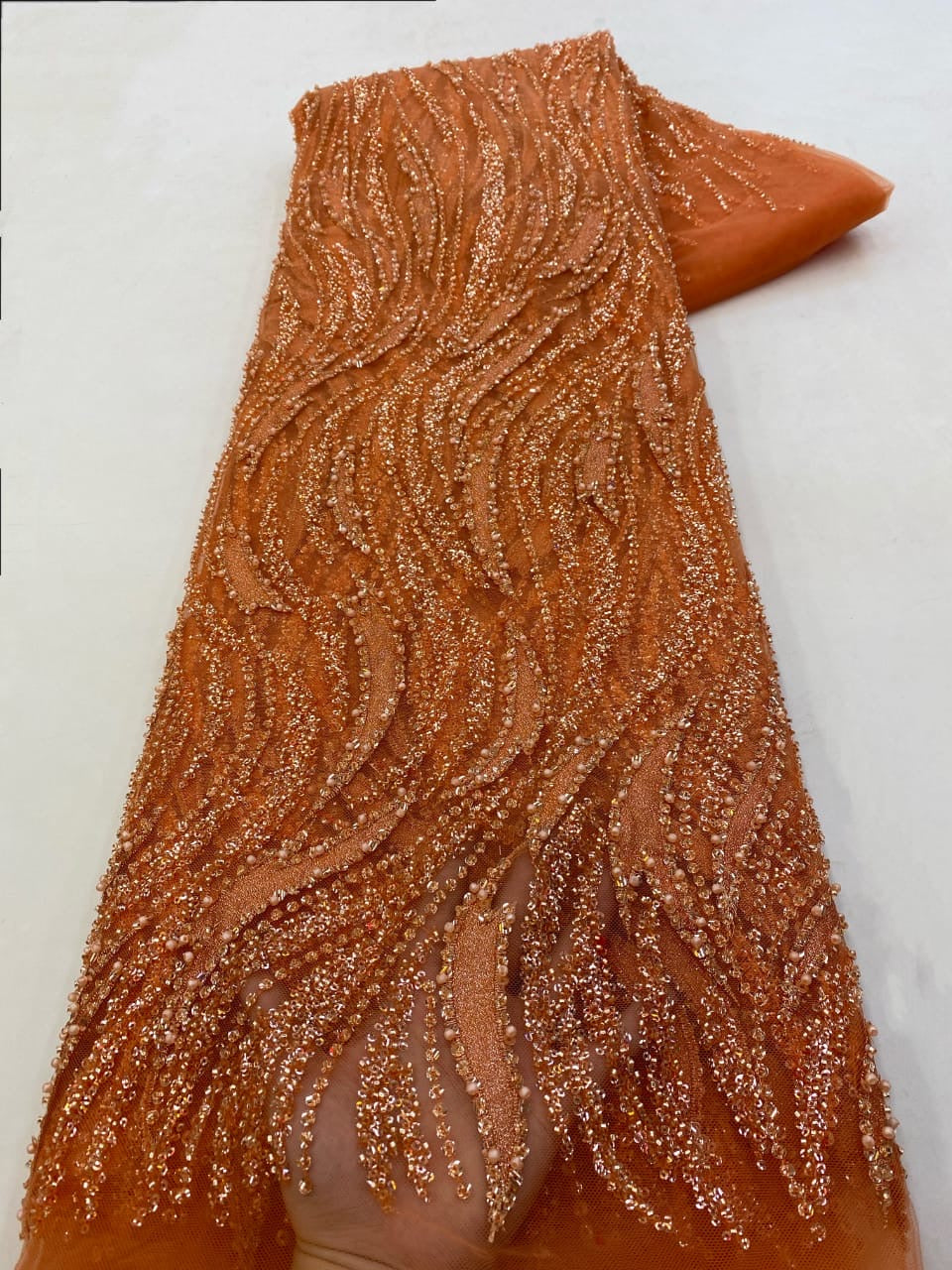 Esta tela de alta calidad se mide en 5 yardas con cuentas bordadas y lentejuelas. Es suave, muy delicado y bonito.