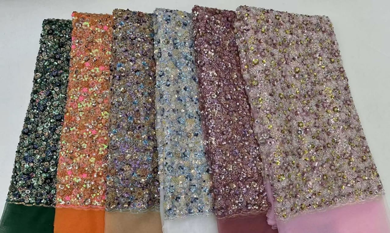 Esta tela de alta calidad está hecha con pedrería bordada a la moda y se puede usar para hacer vestidos de novia, faldas, chales, bufandas y otras prendas de moda que desee.