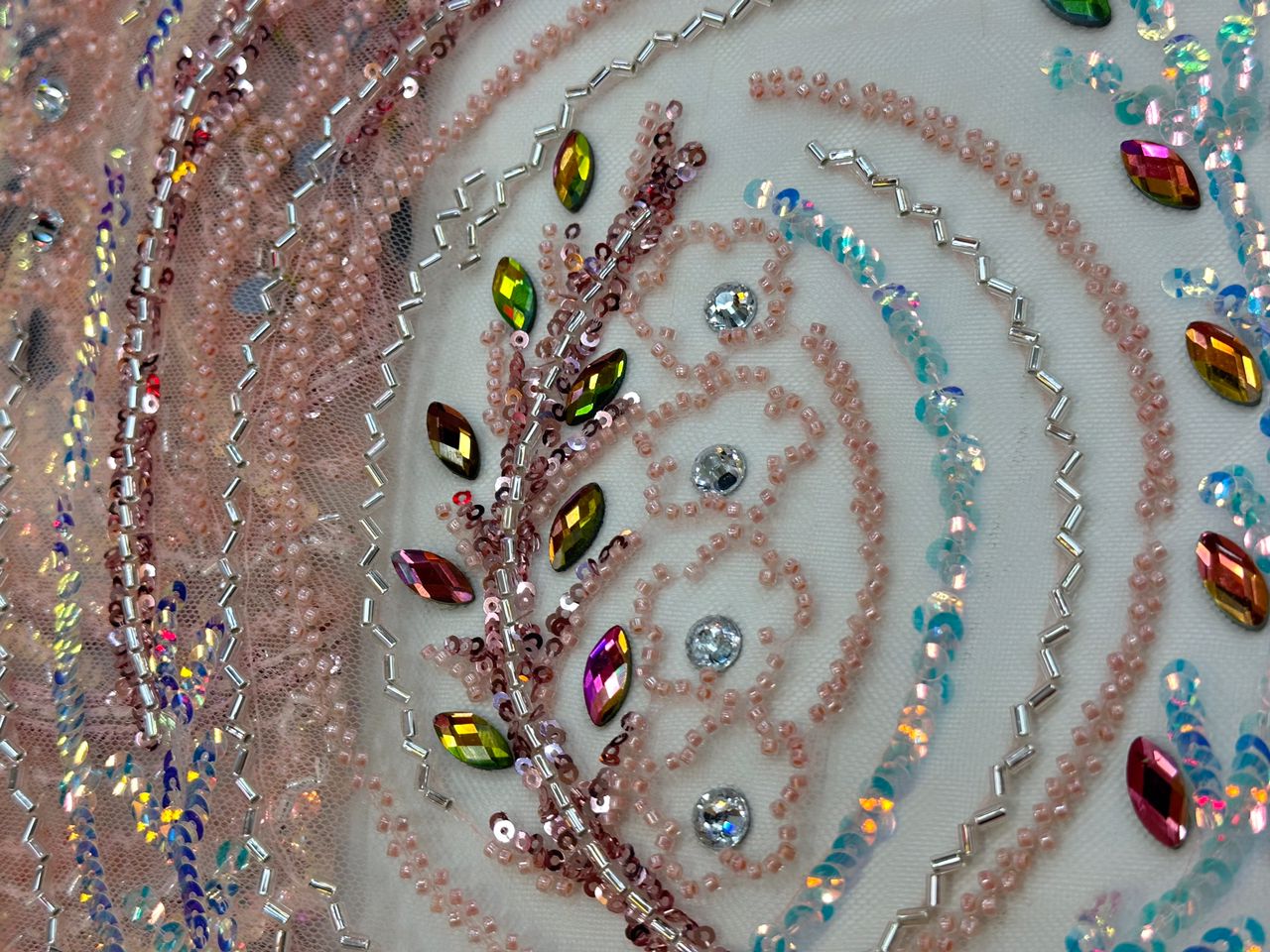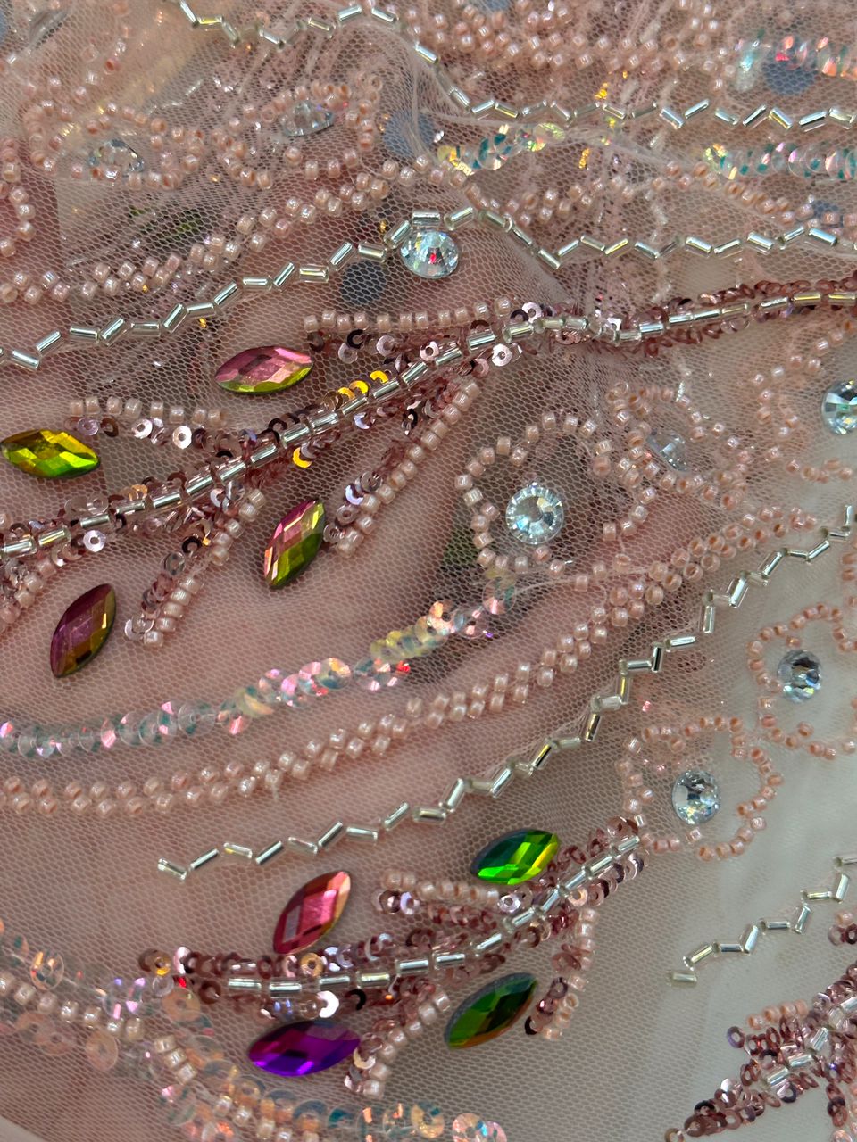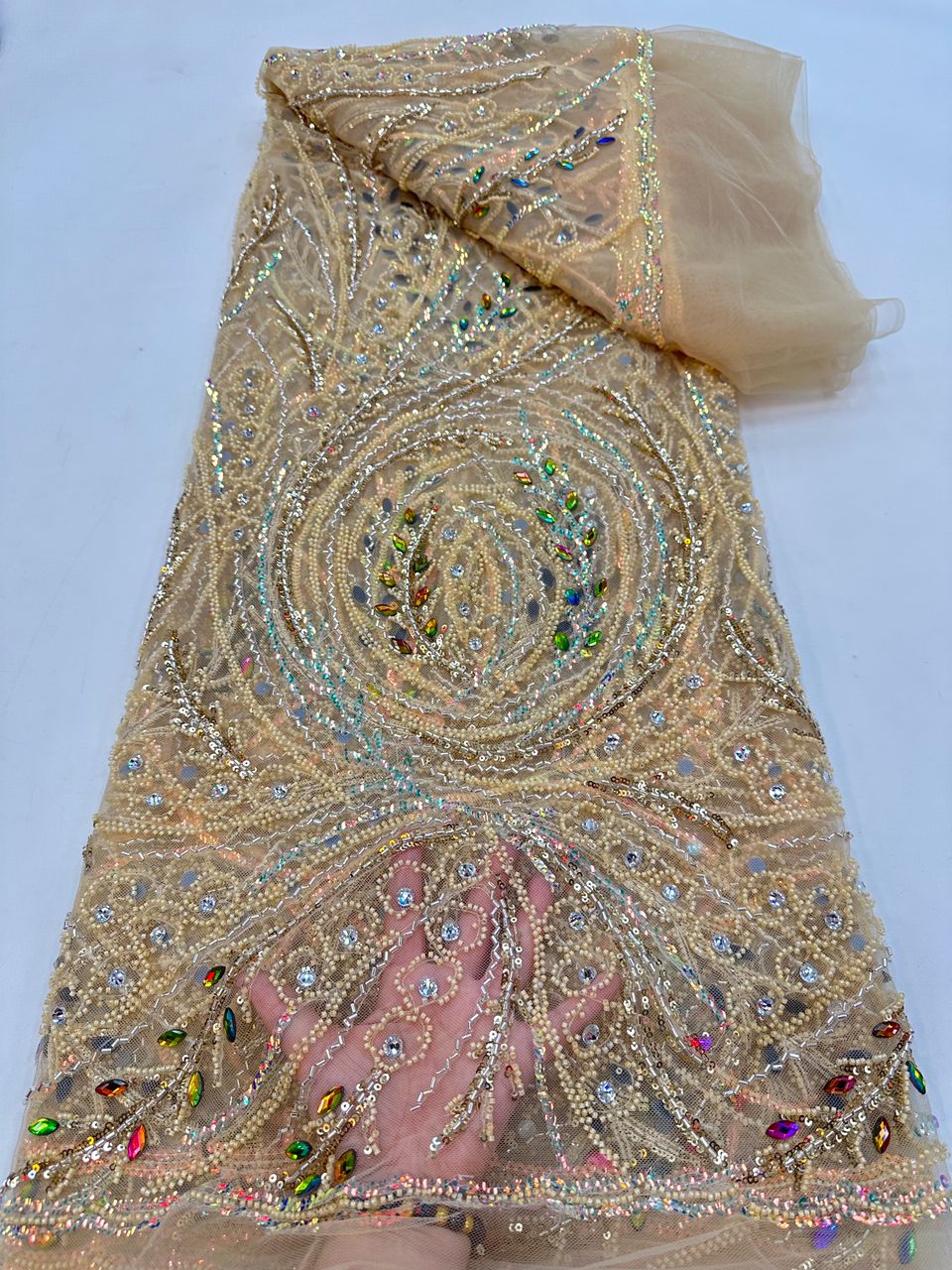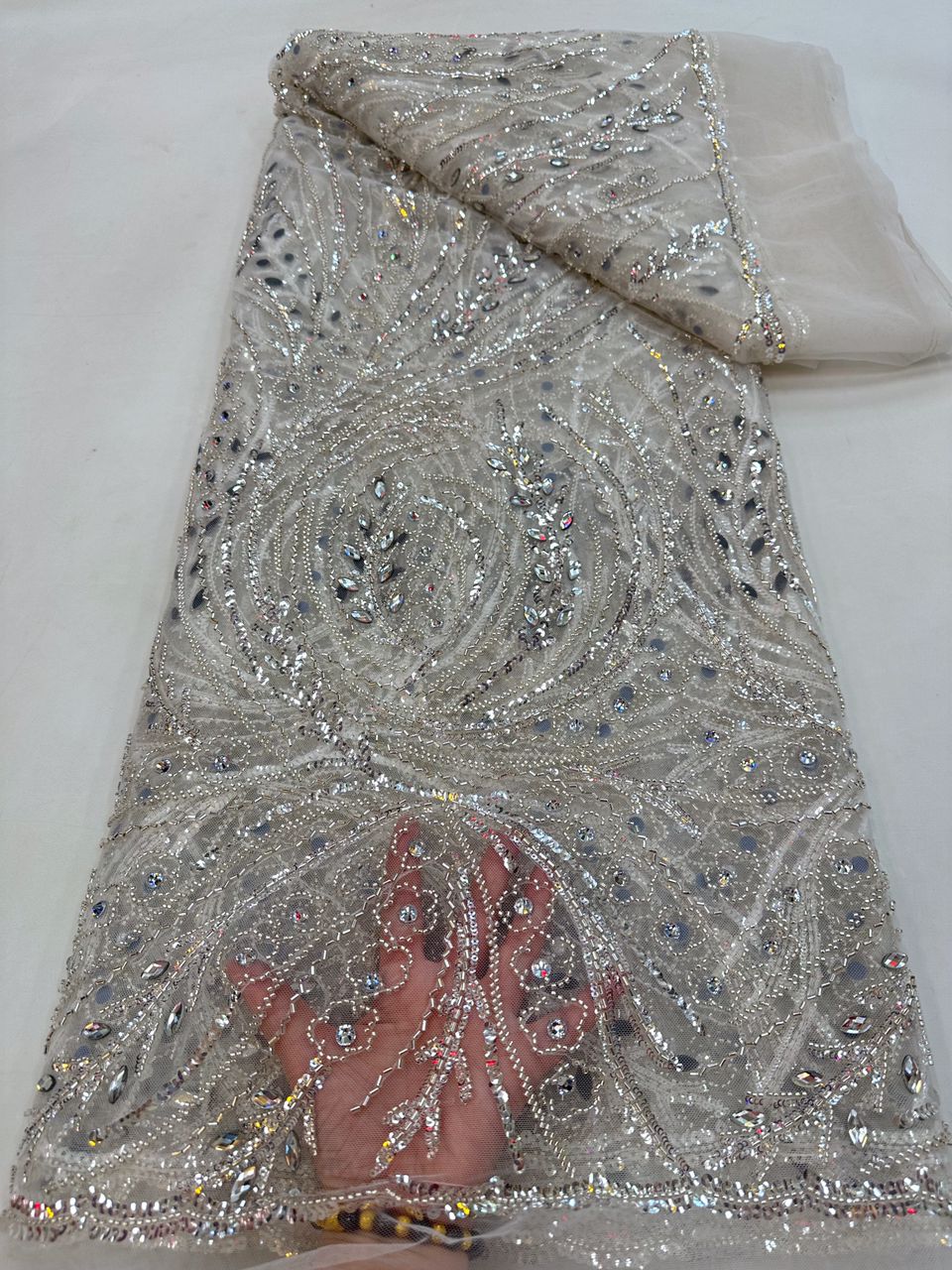 Esta tela de alta calidad está hecha con pedrería bordada a la moda y se puede usar para hacer vestidos de novia, faldas, chales, bufandas y otras prendas de moda que desee.