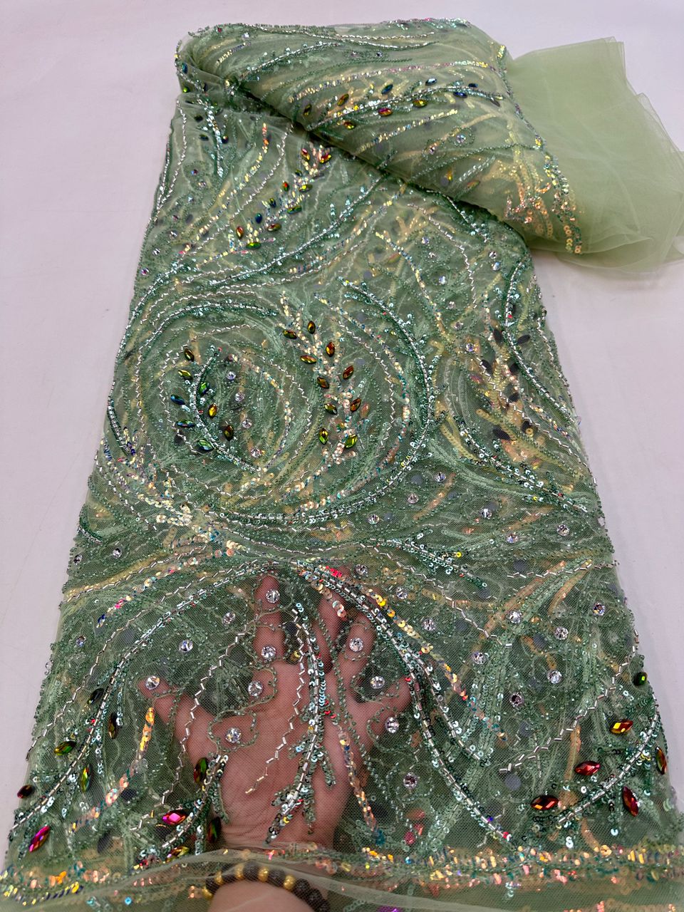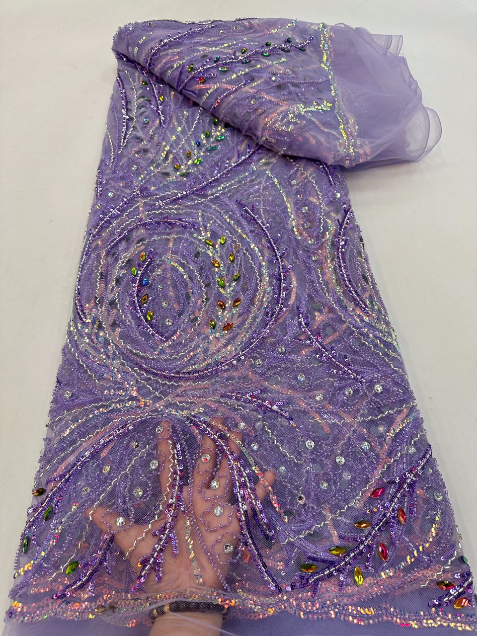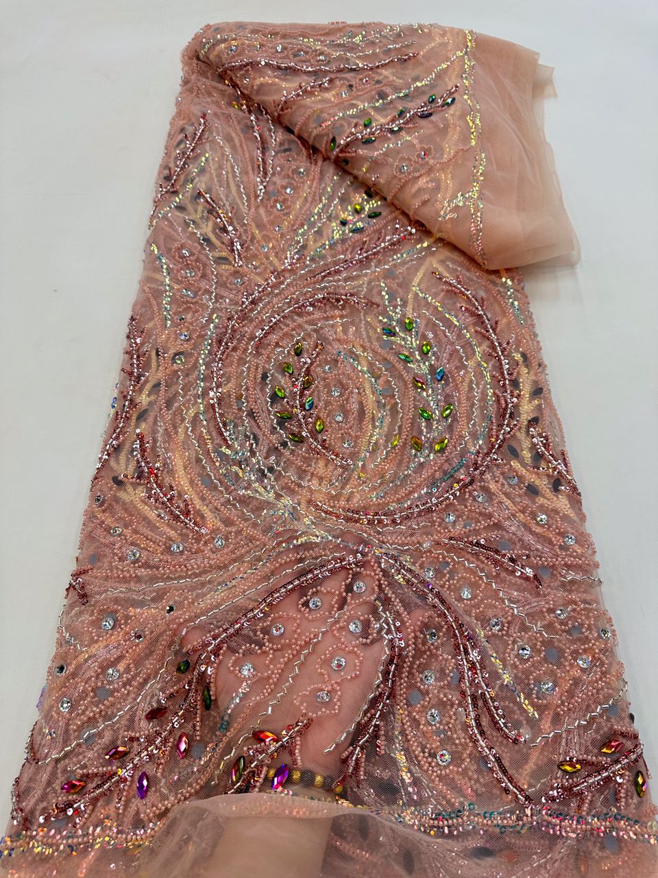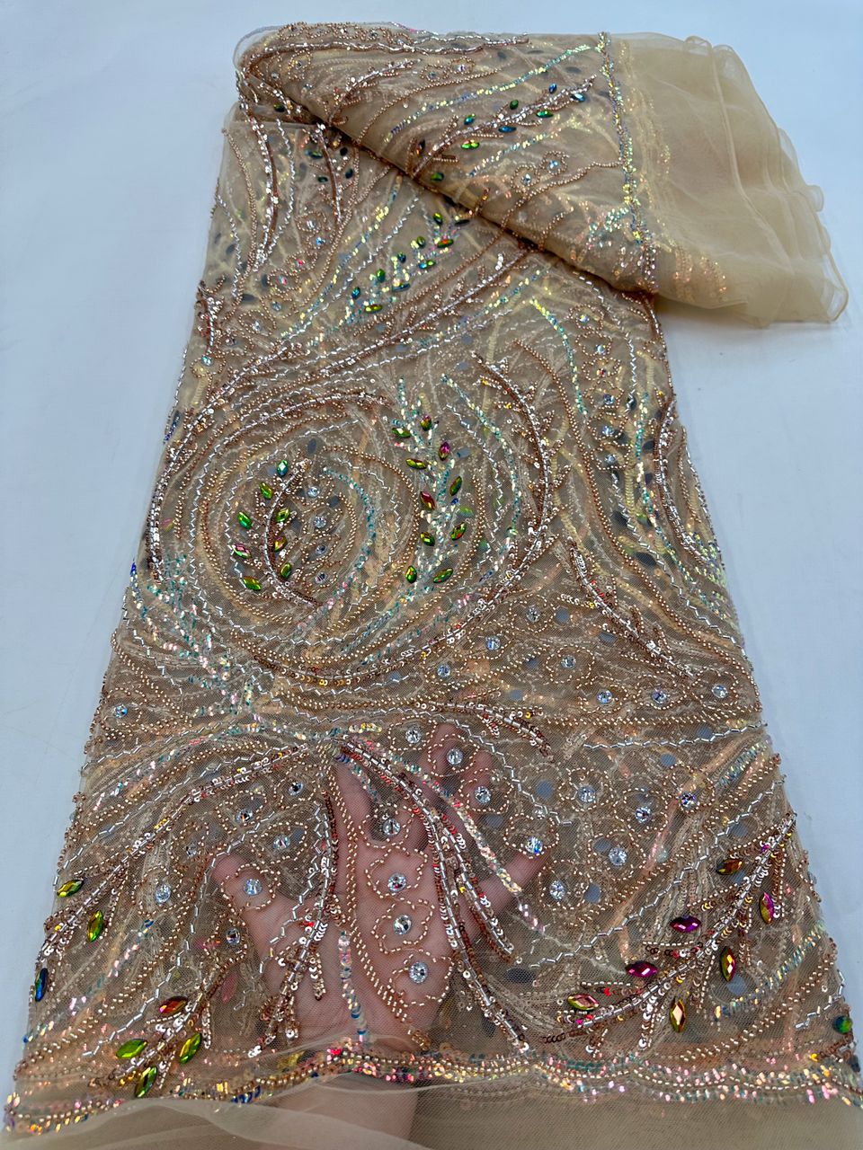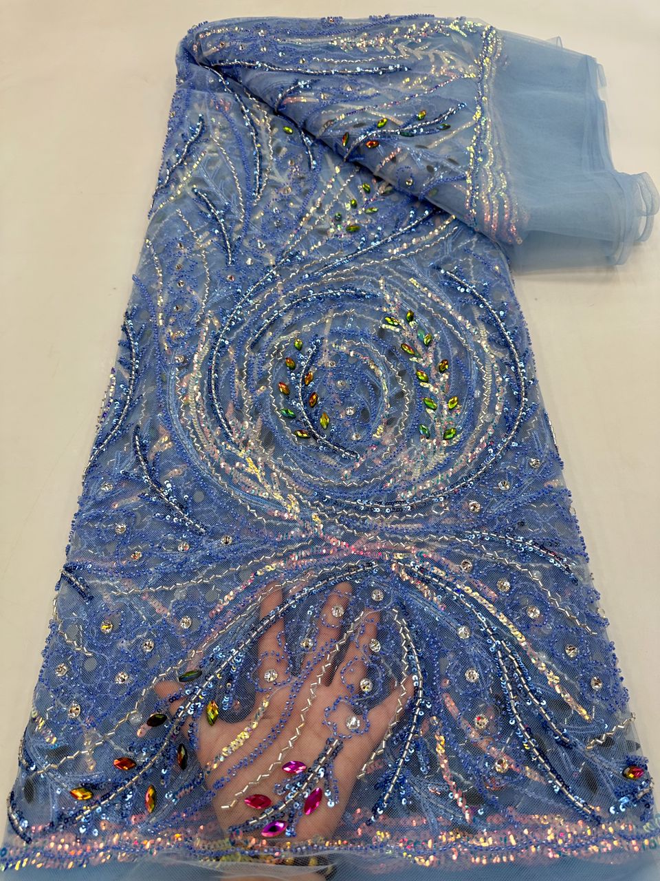 Esta tela de alta calidad se mide en 5 yardas con cuentas bordadas y lentejuelas. Es suave, muy delicado y bonito.