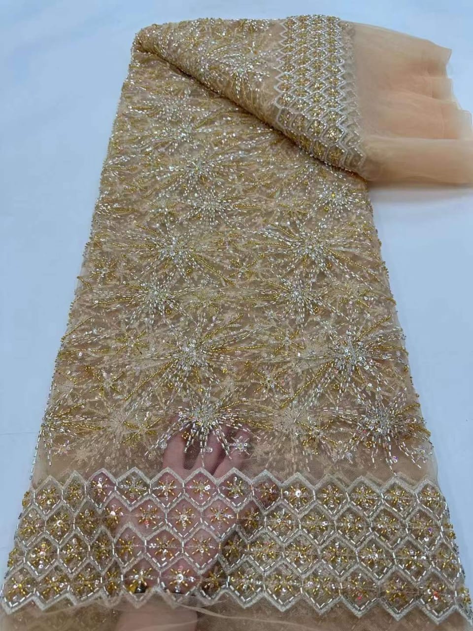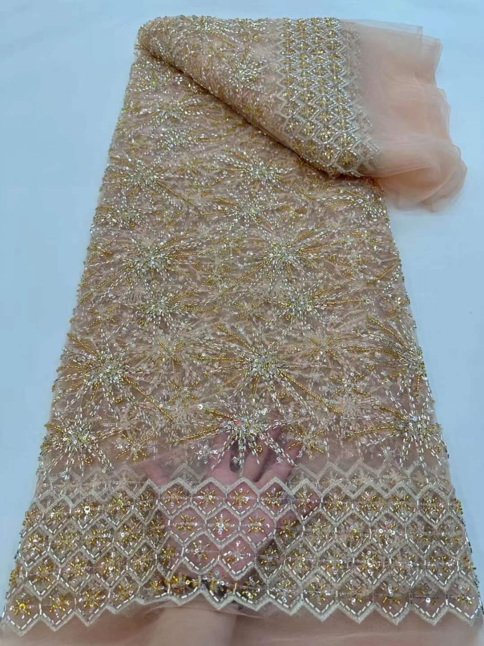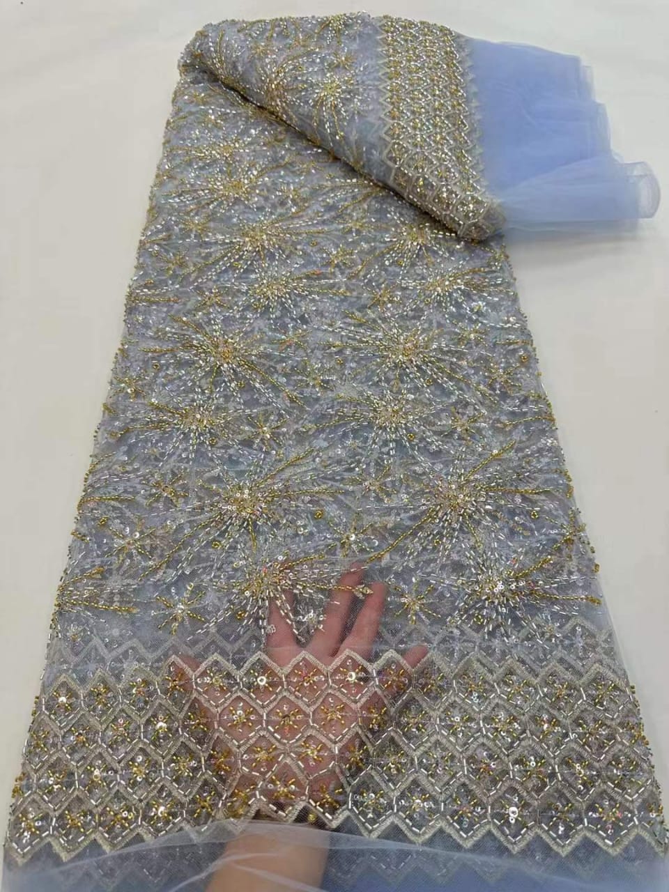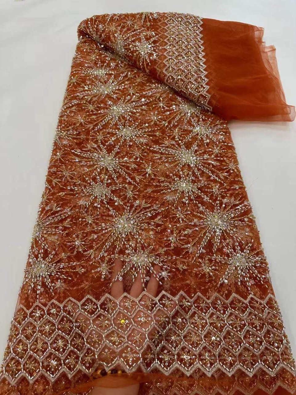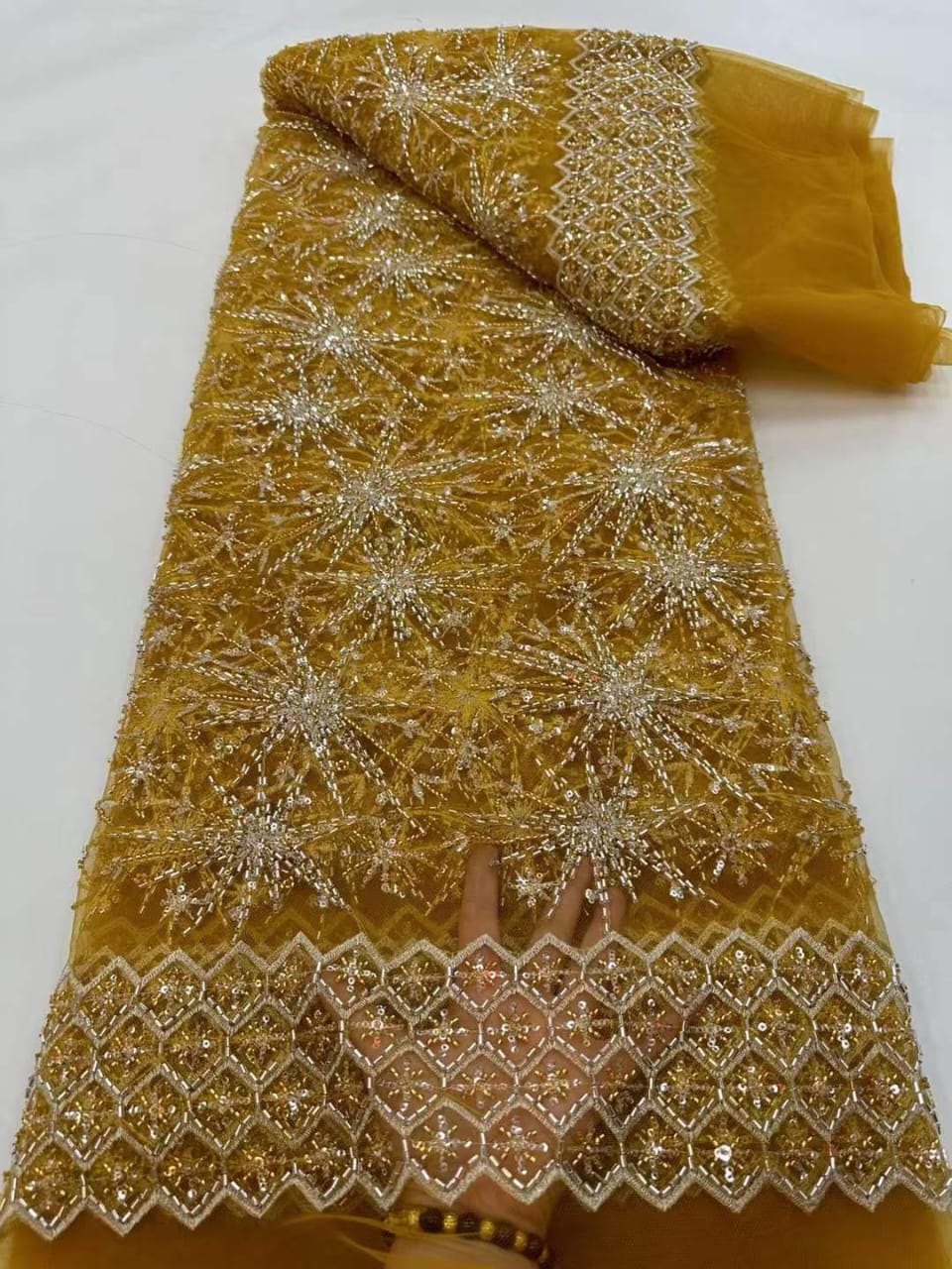 Esta tela de alta calidad se mide en 5 yardas con cuentas bordadas y lentejuelas. Es suave, muy delicado y bonito.