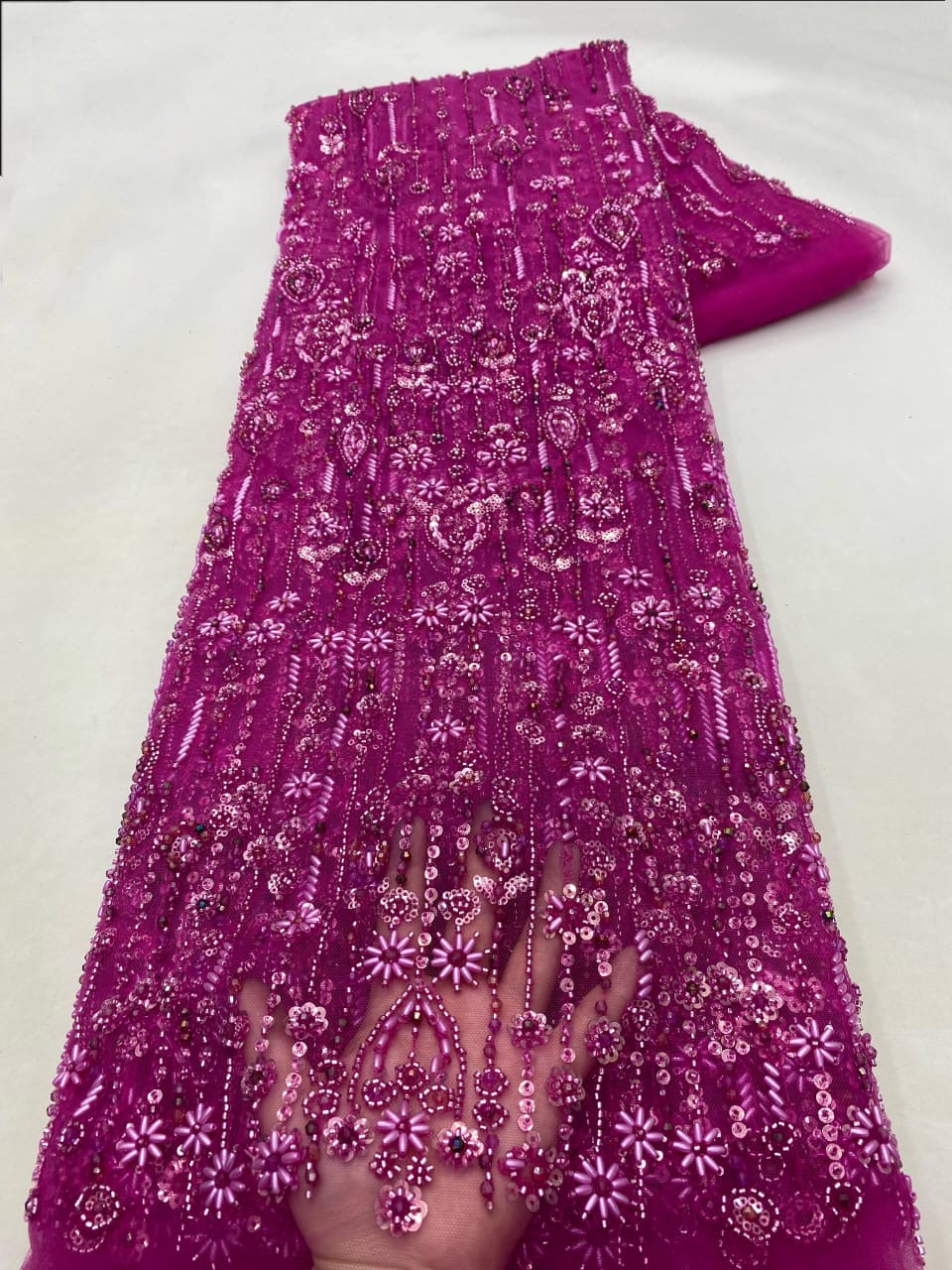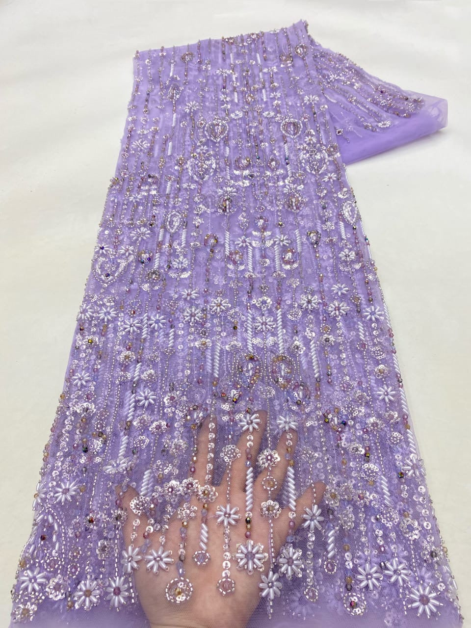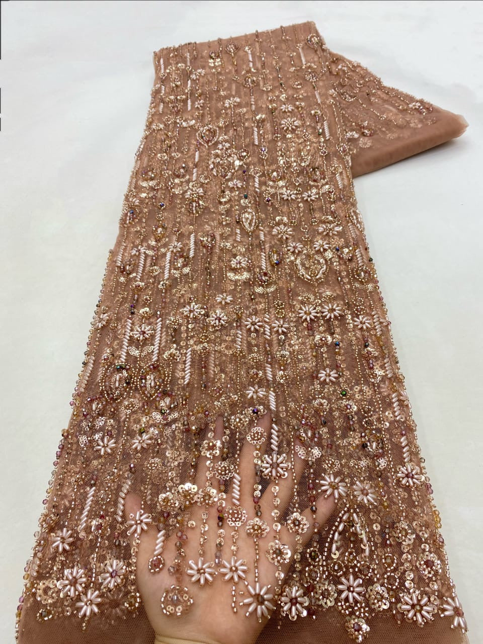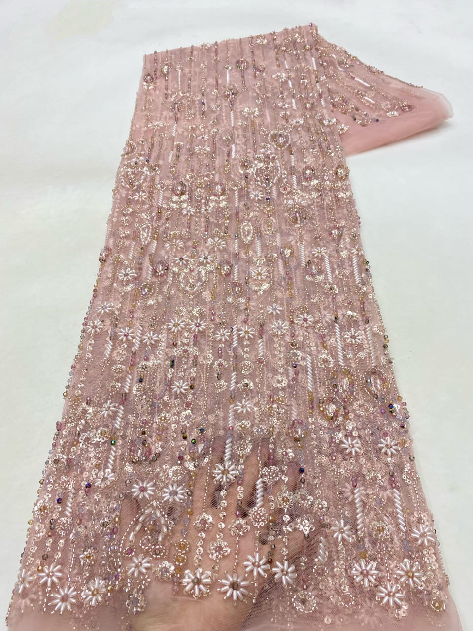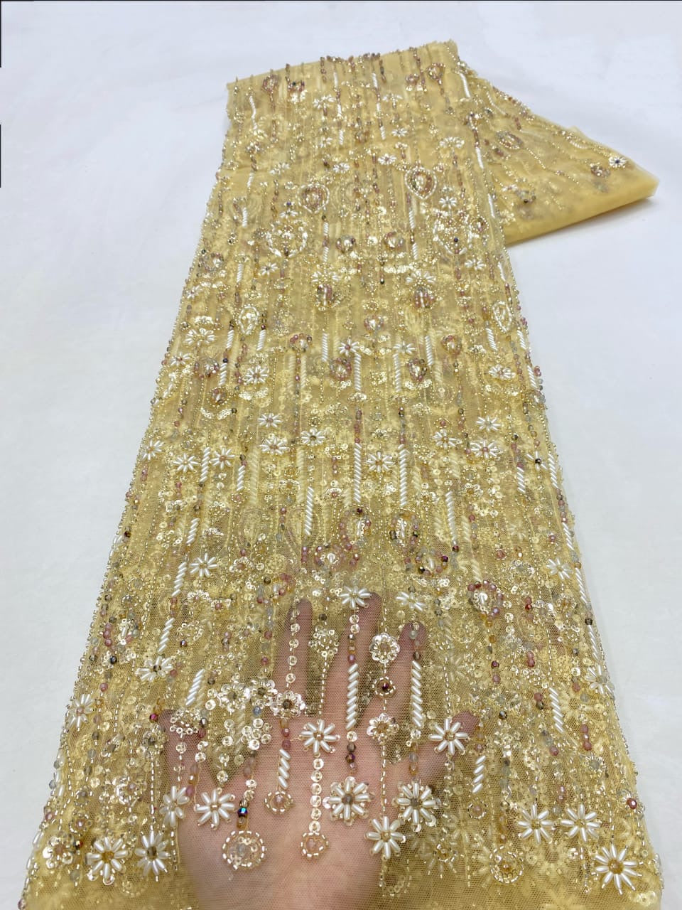 Esta tela de alta calidad se mide en 5 yardas con cuentas bordadas y lentejuelas. Es suave, muy delicado y bonito.