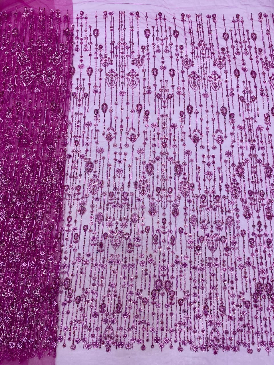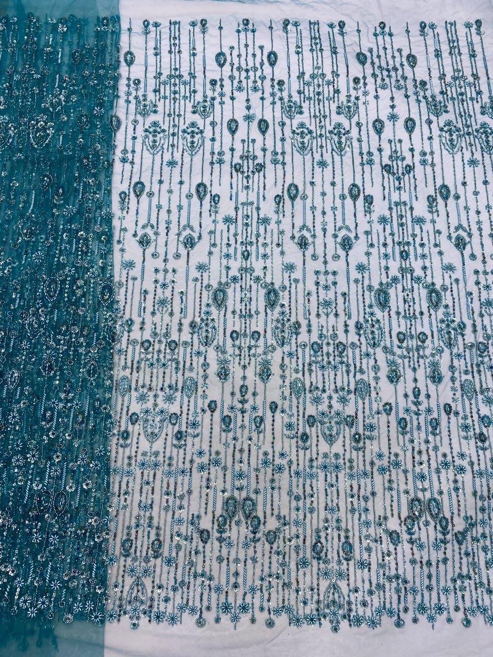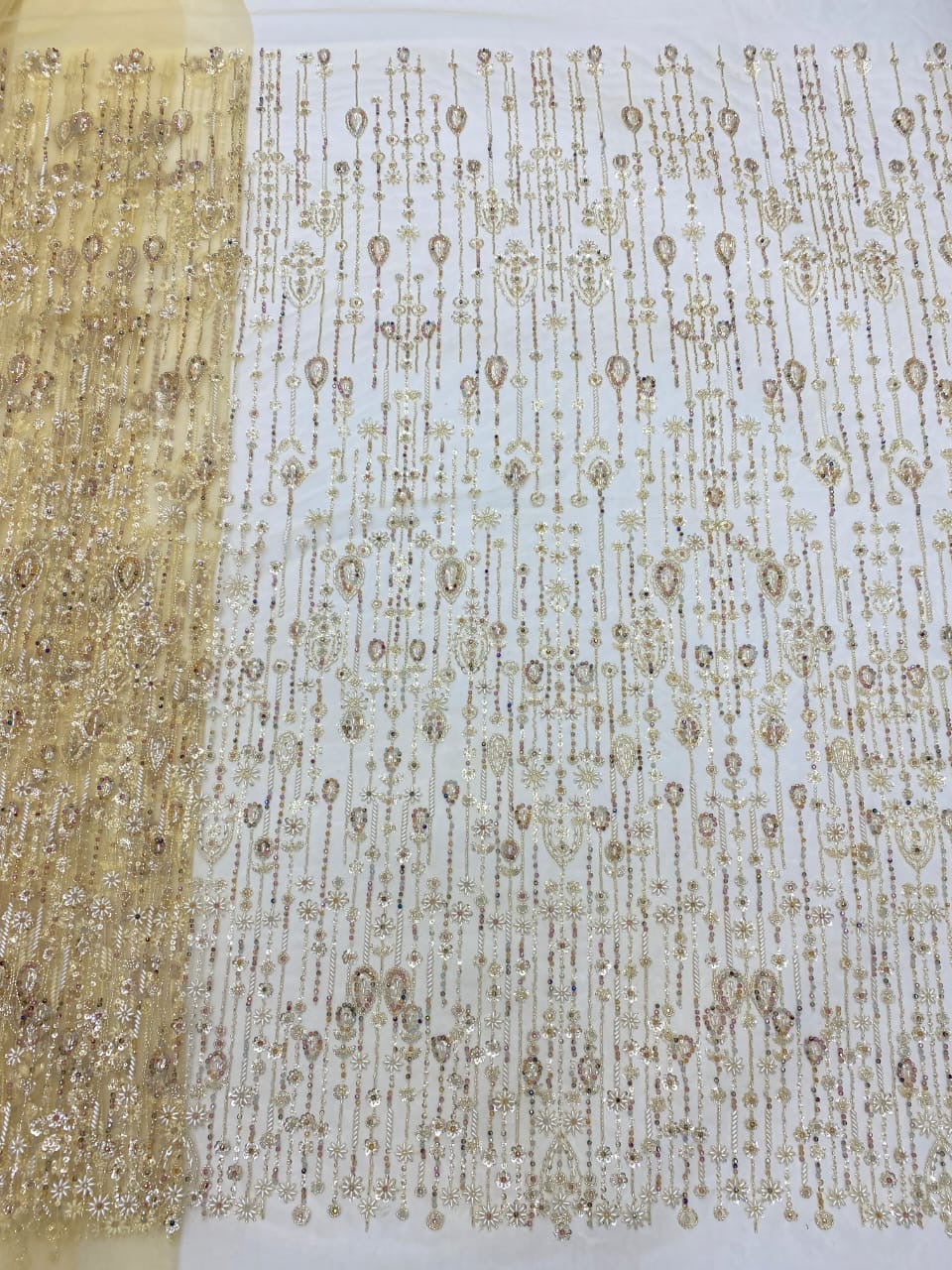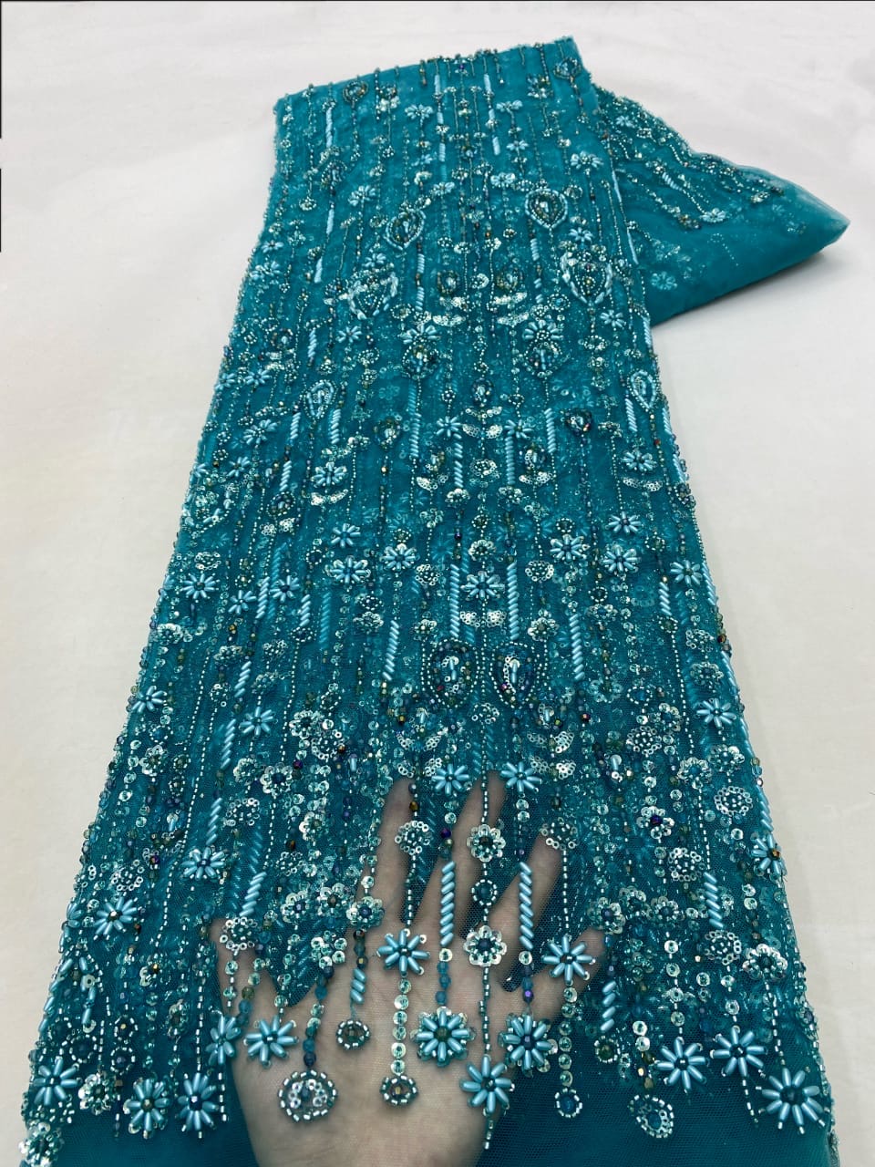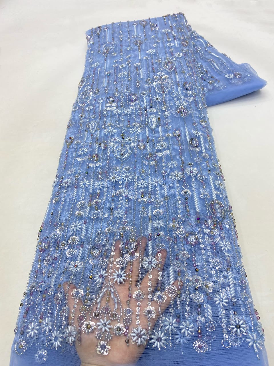 Esta tela de alta calidad se mide en 5 yardas con cuentas bordadas y lentejuelas. Es suave, muy delicado y bonito.