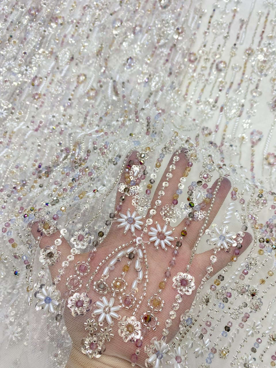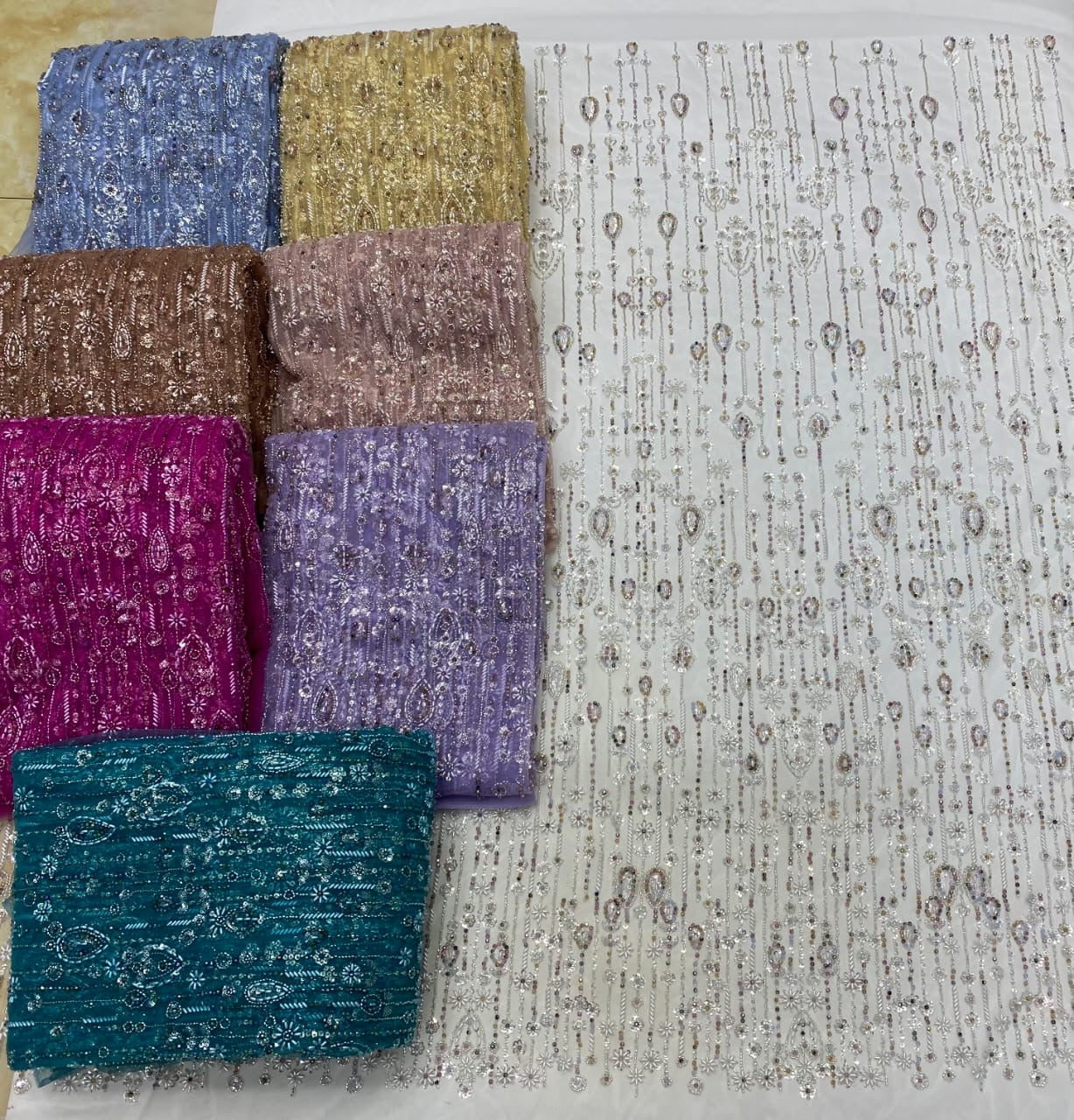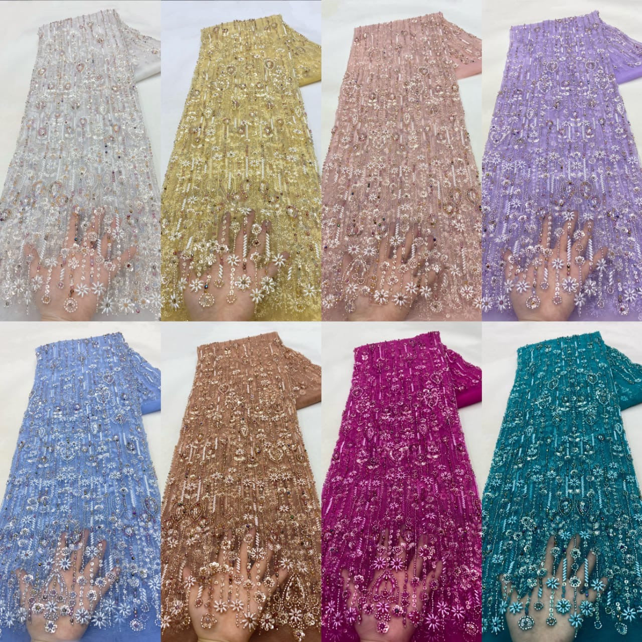 Esta tela de alta calidad está hecha con pedrería bordada a la moda y se puede usar para hacer vestidos de novia, faldas, chales, bufandas y otras prendas de moda que desee.