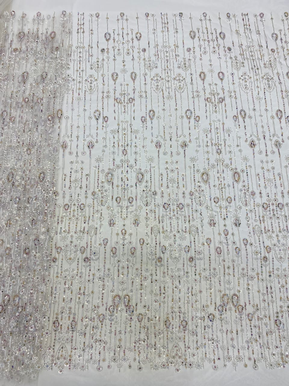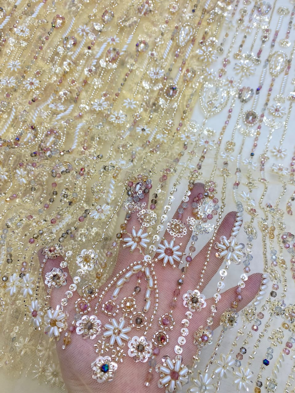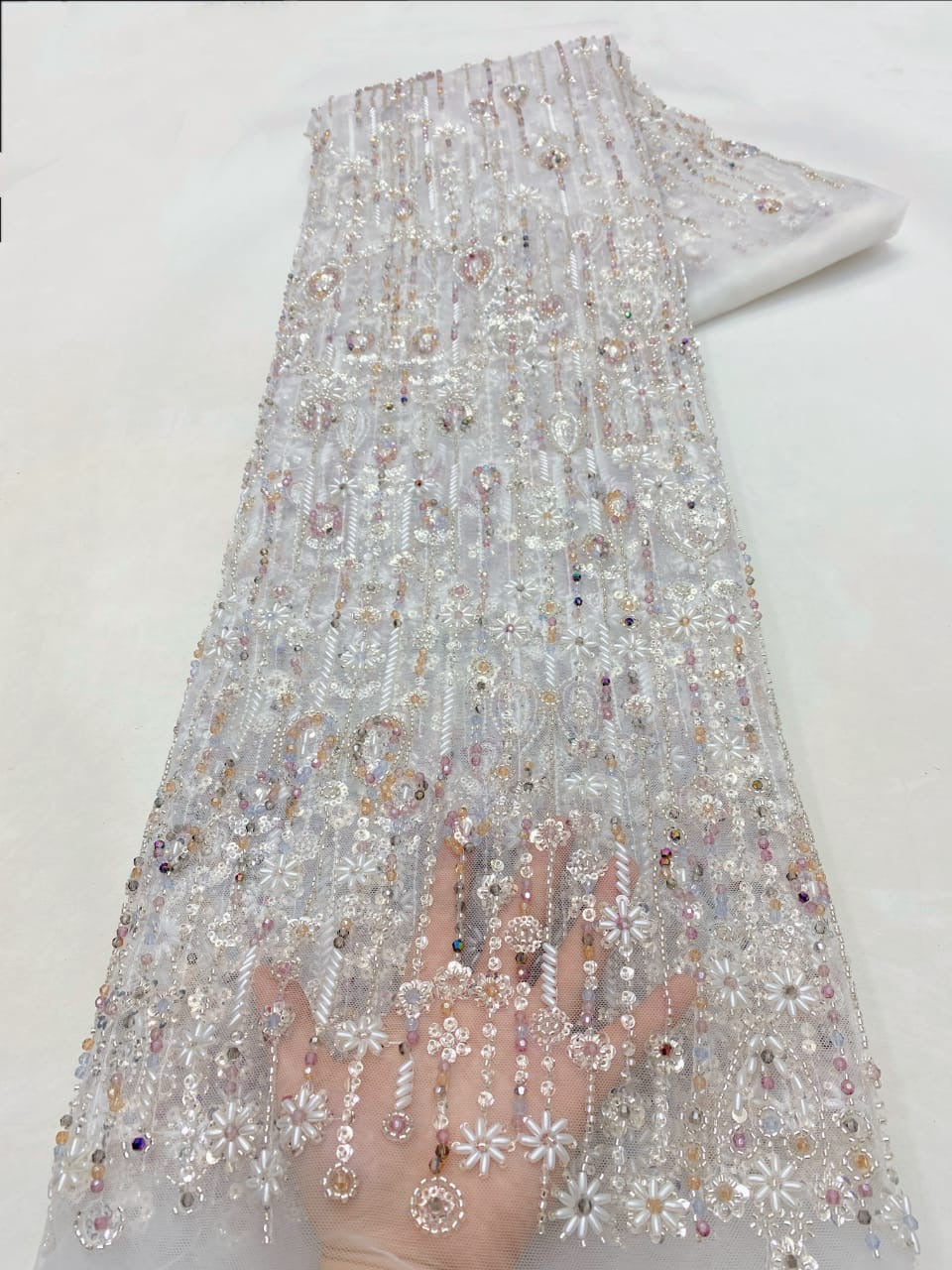 Esta tela de alta calidad está hecha con pedrería bordada a la moda y se puede usar para hacer vestidos de novia, faldas, chales, bufandas y otras prendas de moda que desee.