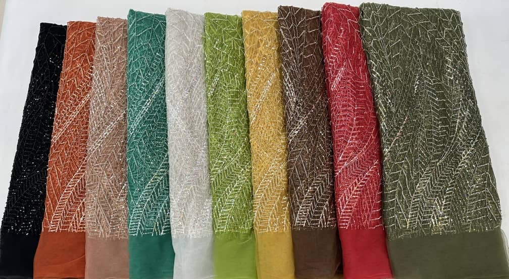 Esta tela de alta calidad está hecha con pedrería bordada a la moda y se puede usar para hacer vestidos de novia, faldas, chales, bufandas y otras prendas de moda que desee.