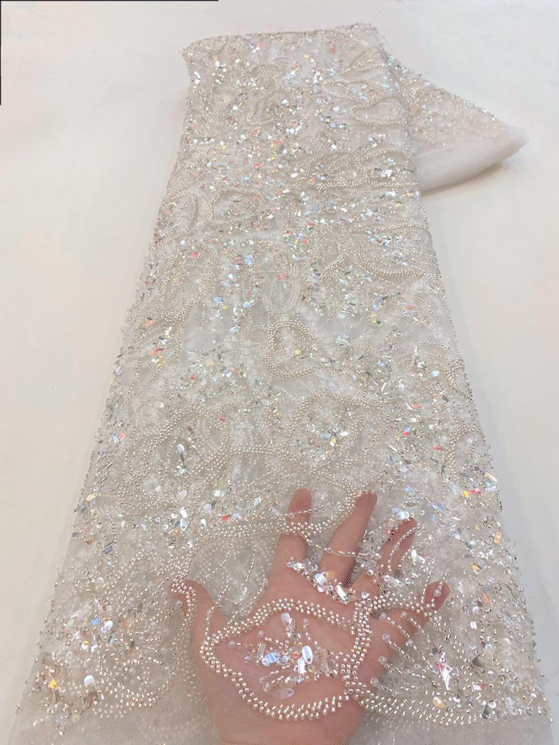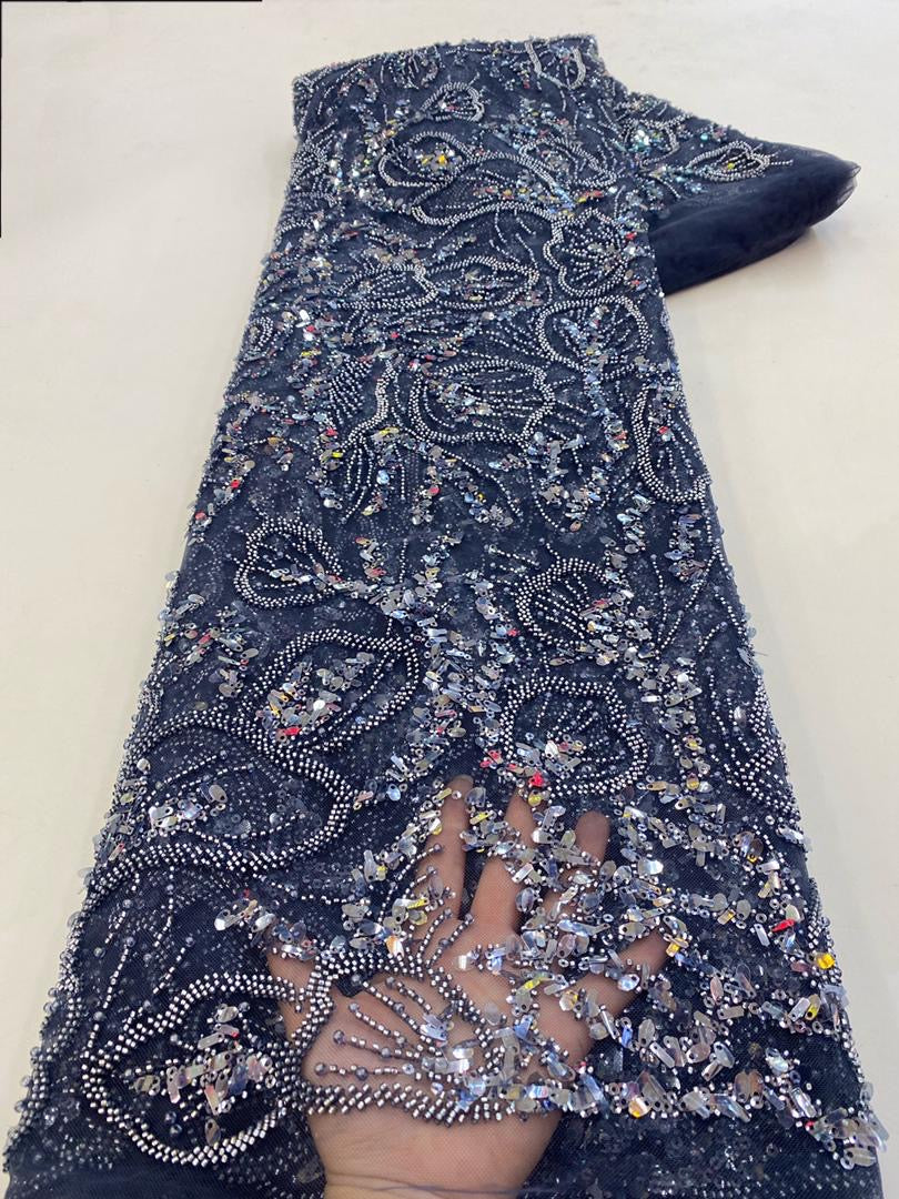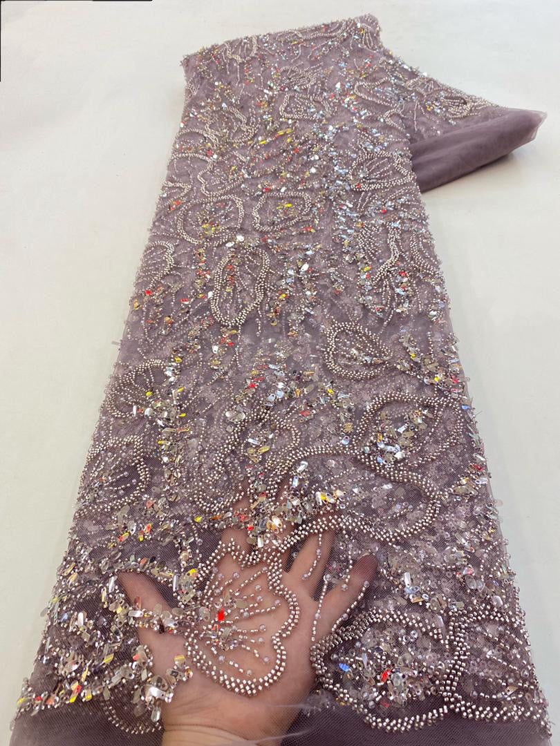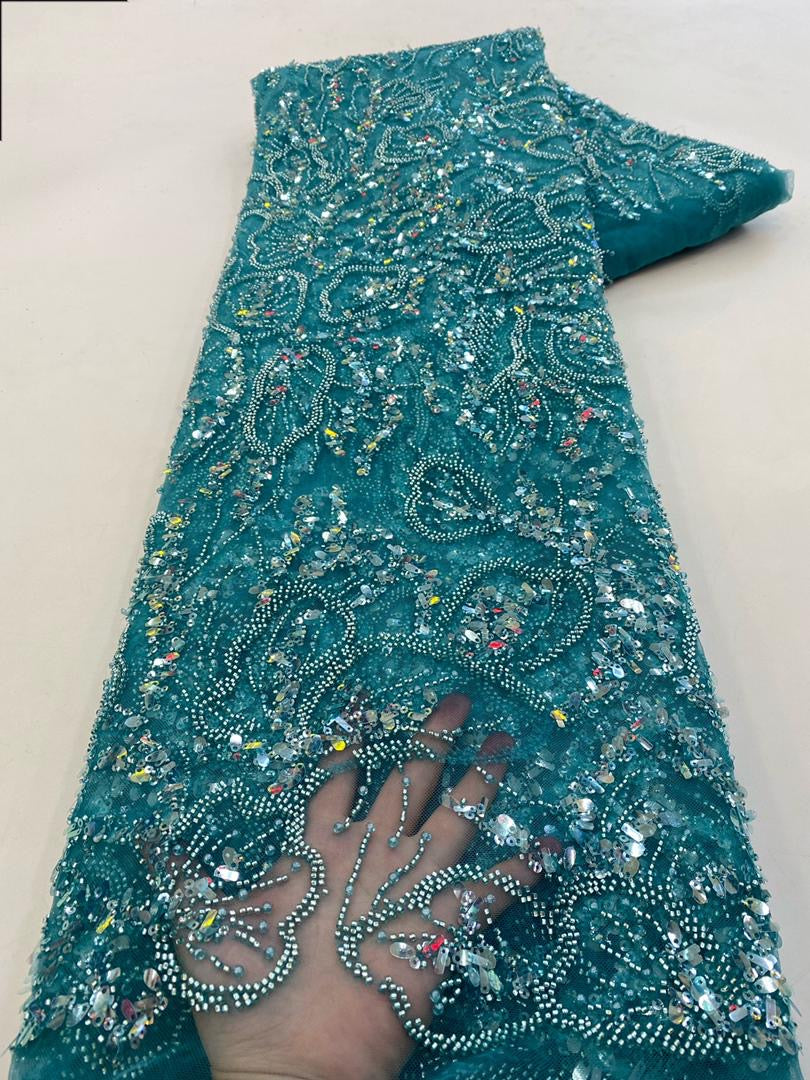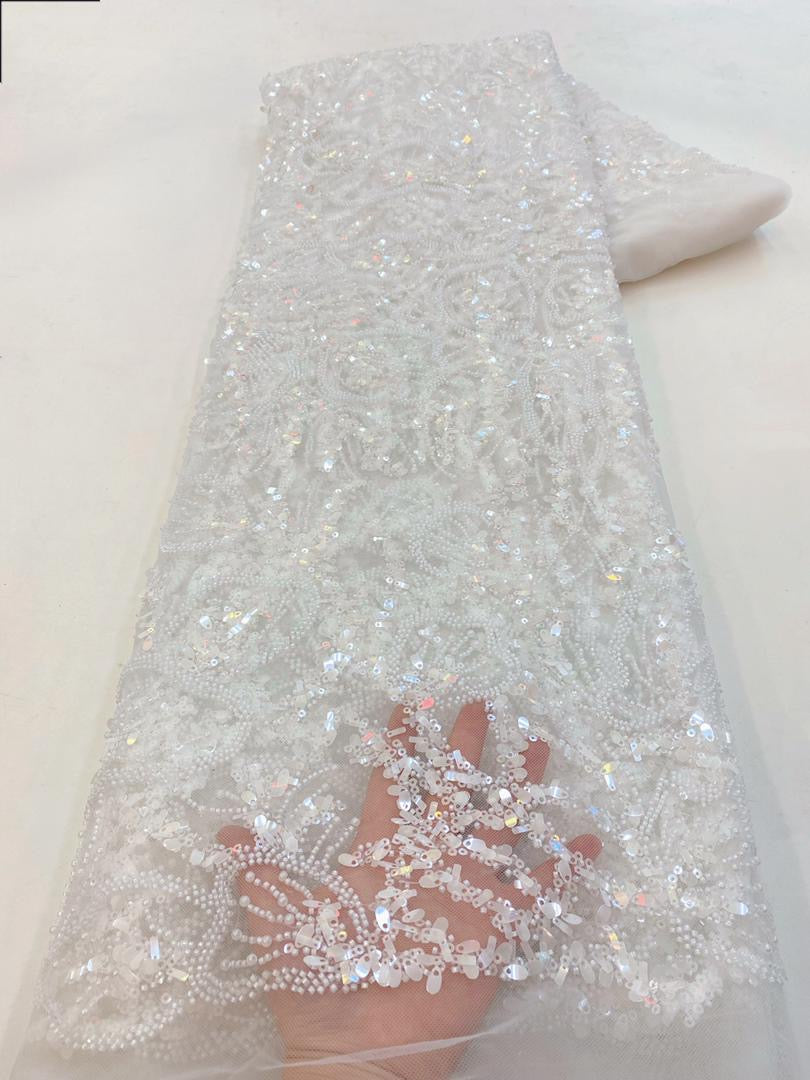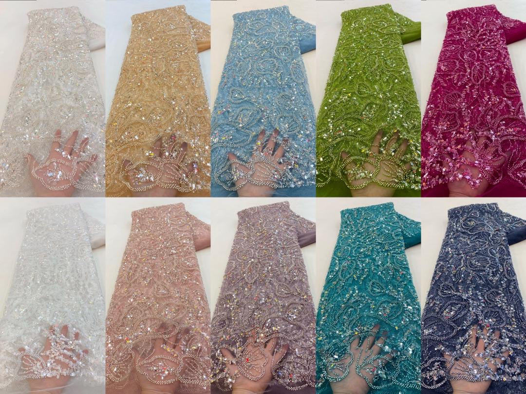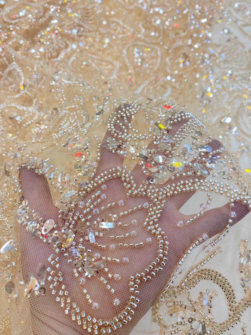 Esta tela de alta calidad se mide en 5 yardas con cuentas bordadas y lentejuelas. Es suave, muy delicado y bonito.