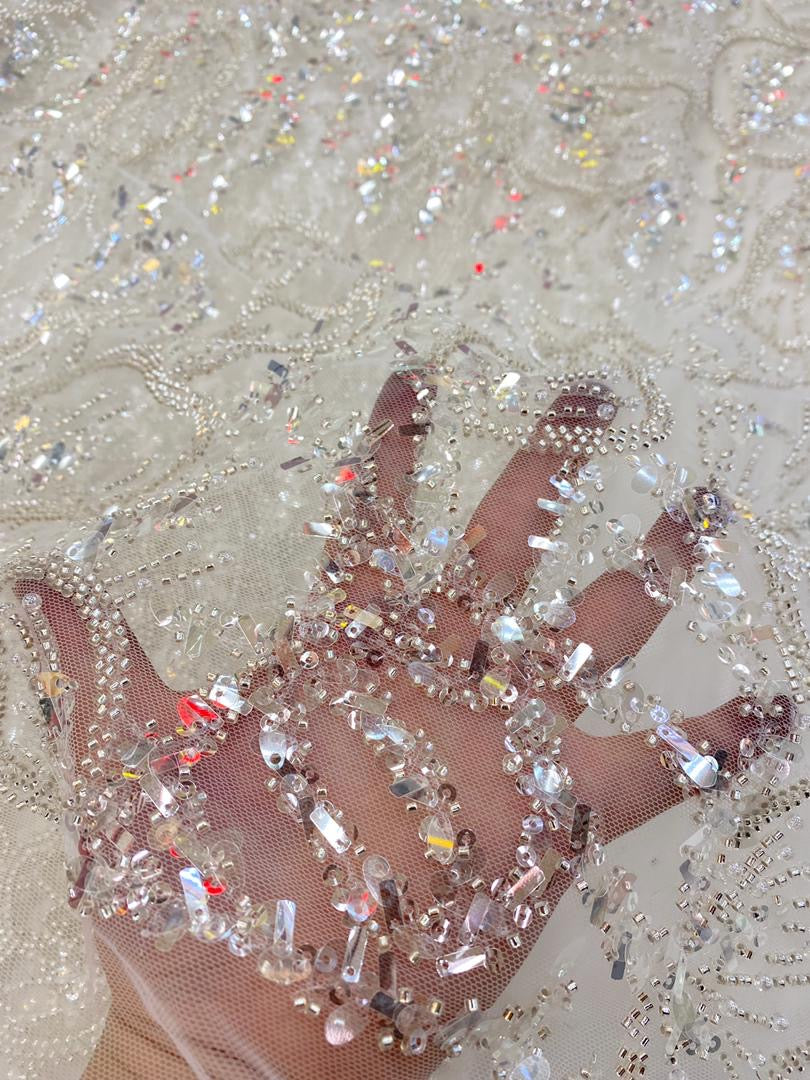 Esta tela de alta calidad está hecha con pedrería bordada a la moda y se puede usar para hacer vestidos de novia, faldas, chales, bufandas y otras prendas de moda que desee.